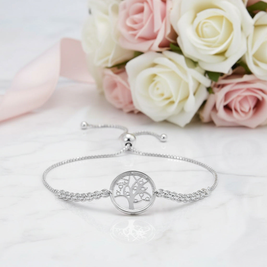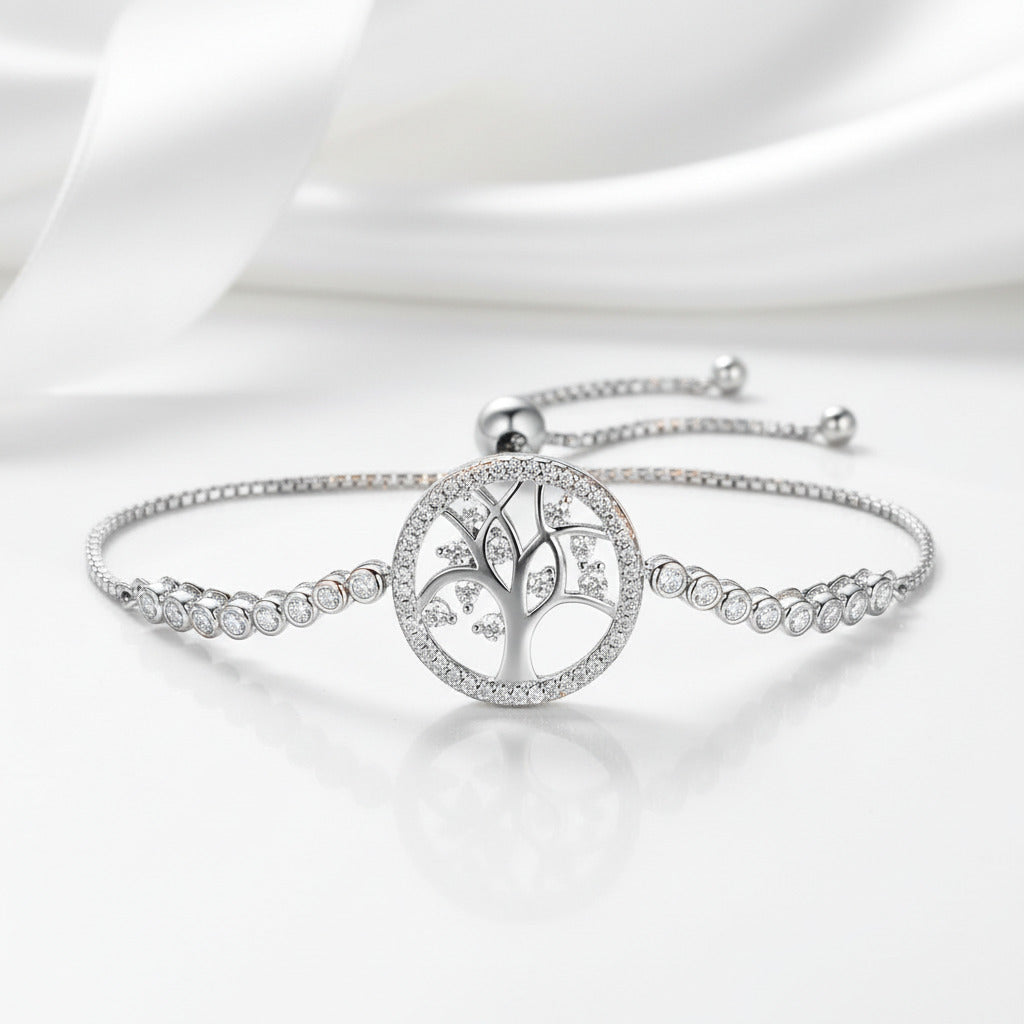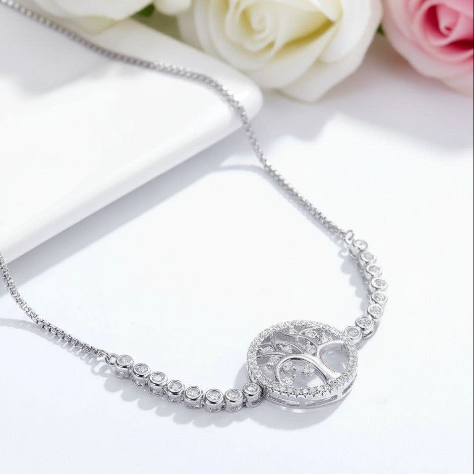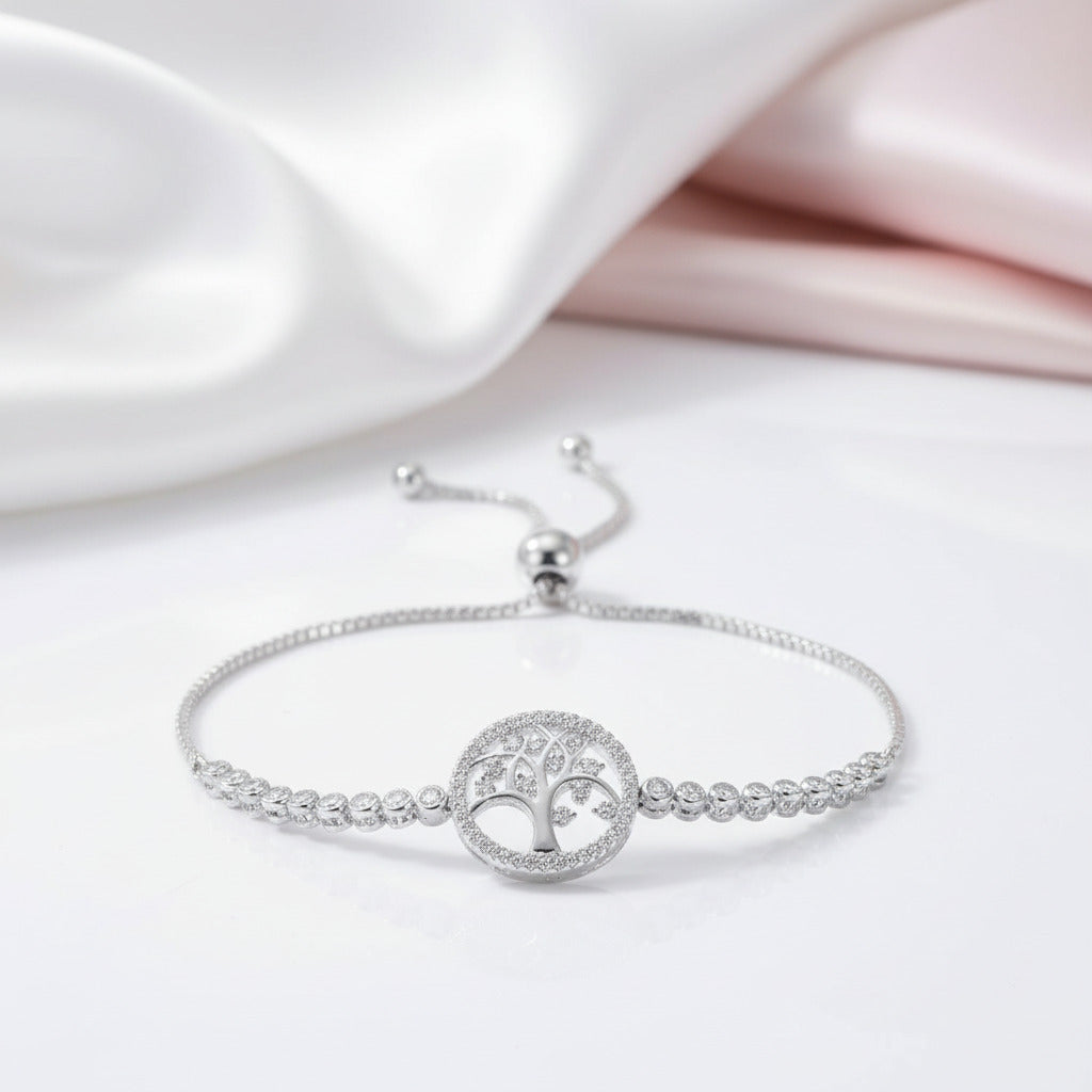 Indulge in the opulence of our Tree of Life Bolo Bracelet, crafted from 925 silver with a lustrous white gold plating. The adjustable chain allows for a perfect fit while the simulated diamond gems evoke a sense of elegance and refinement.