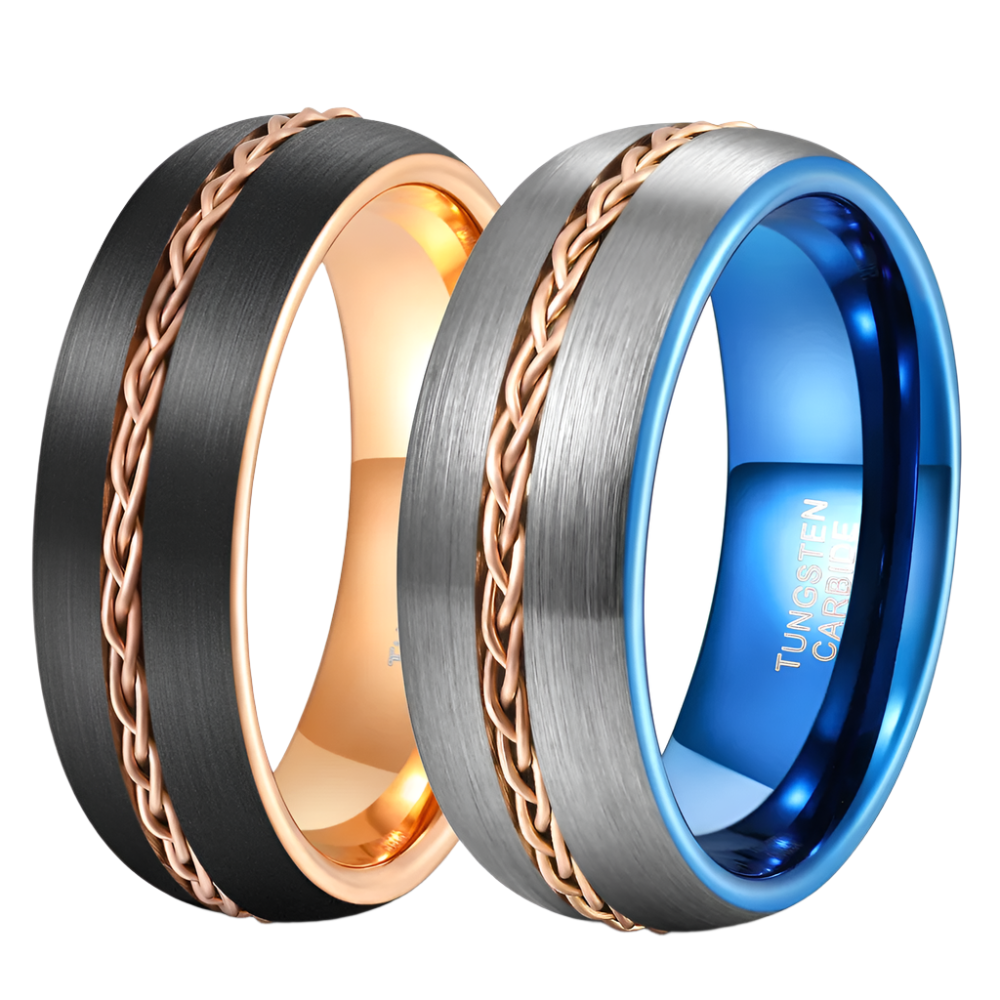 This striking ring is made of durable tungsten carbide and features a unique 8mm width. The classic style is accented with a rose gold steel wire inlay and comes in four stunning plating options: silver, black, blue, and rose gold. With a weight of 15g, this ring is both lightweight and substantial in design. It's the perfect accessory for any stylish and confident man.