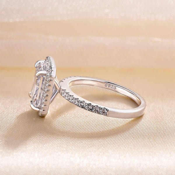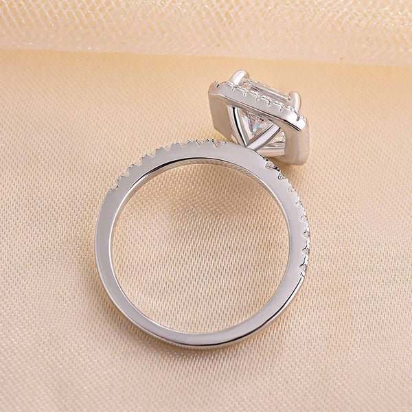Indulge in a stunningly beautiful engagement with this elegant 3ct Halo Radiant Cut Certified Moissanite