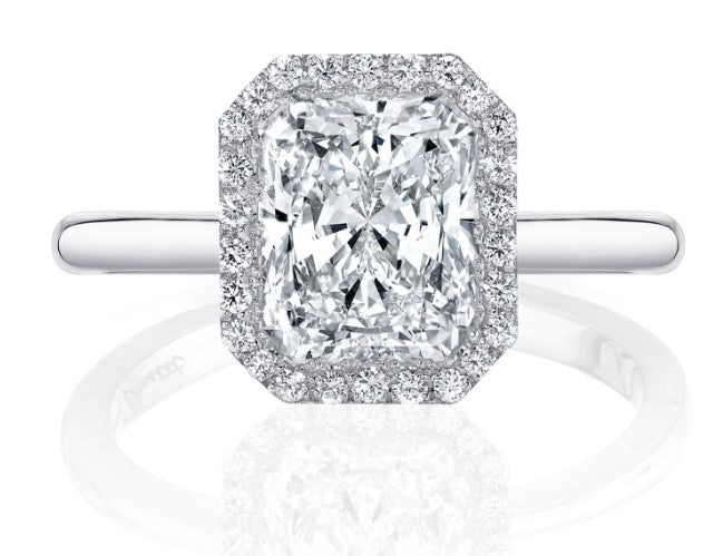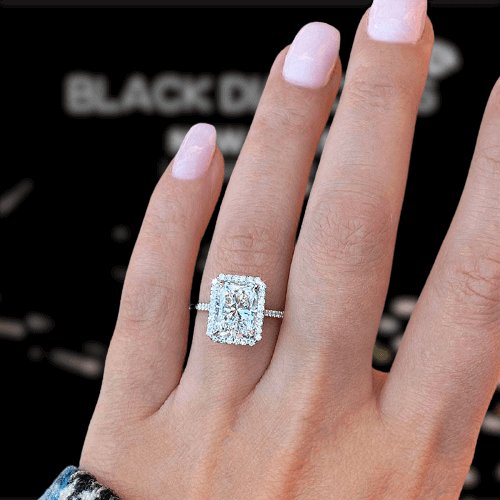 Engagement Ring from Black Diamonds New York. This high-quality piece features a radiant-cut diamond encircled with a halo of tiny round side stones that gives a shimmering and sophisticated look. The perfect statement of your love, this affordable and eye-catching ring will make her say 'I do.' in the market that shares the same quality and affordability as our stones.