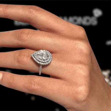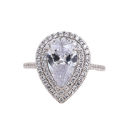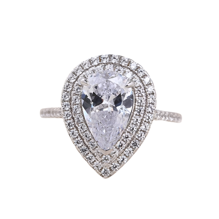 Indulge in the opulence of our White Gold Double Halo Pear Cut Engagement Ring. Featuring a sparkling simulated diamond pear cut center stone surrounded by round cut side stones, this piece radiates elegance and sophistication. The clear stones are set in a luxurious white gold plating on a sterling silver band, creating a truly stunning piece of art. Elevate your style with this exclusive engagement ring.