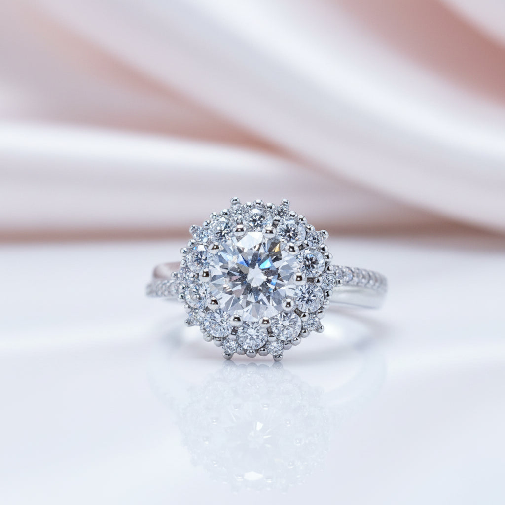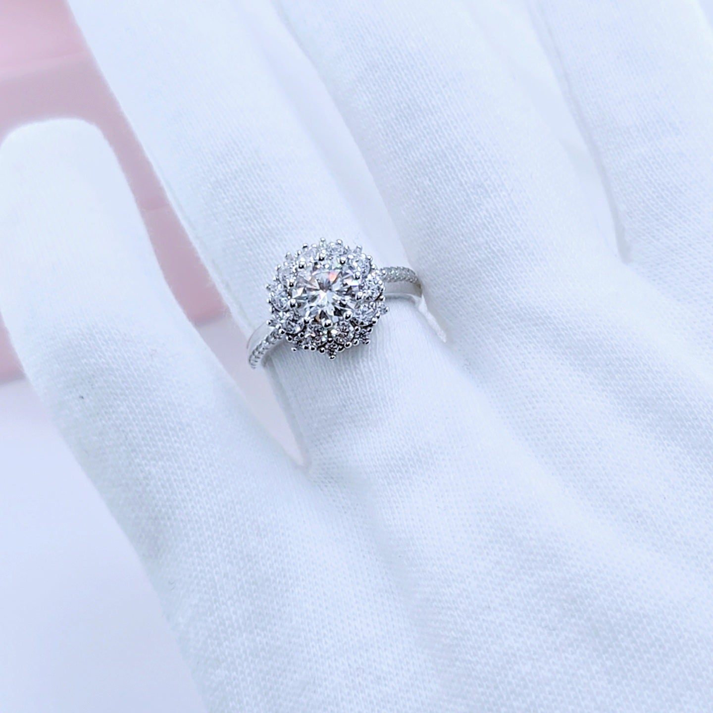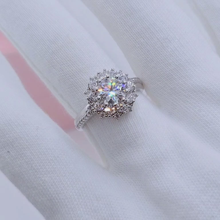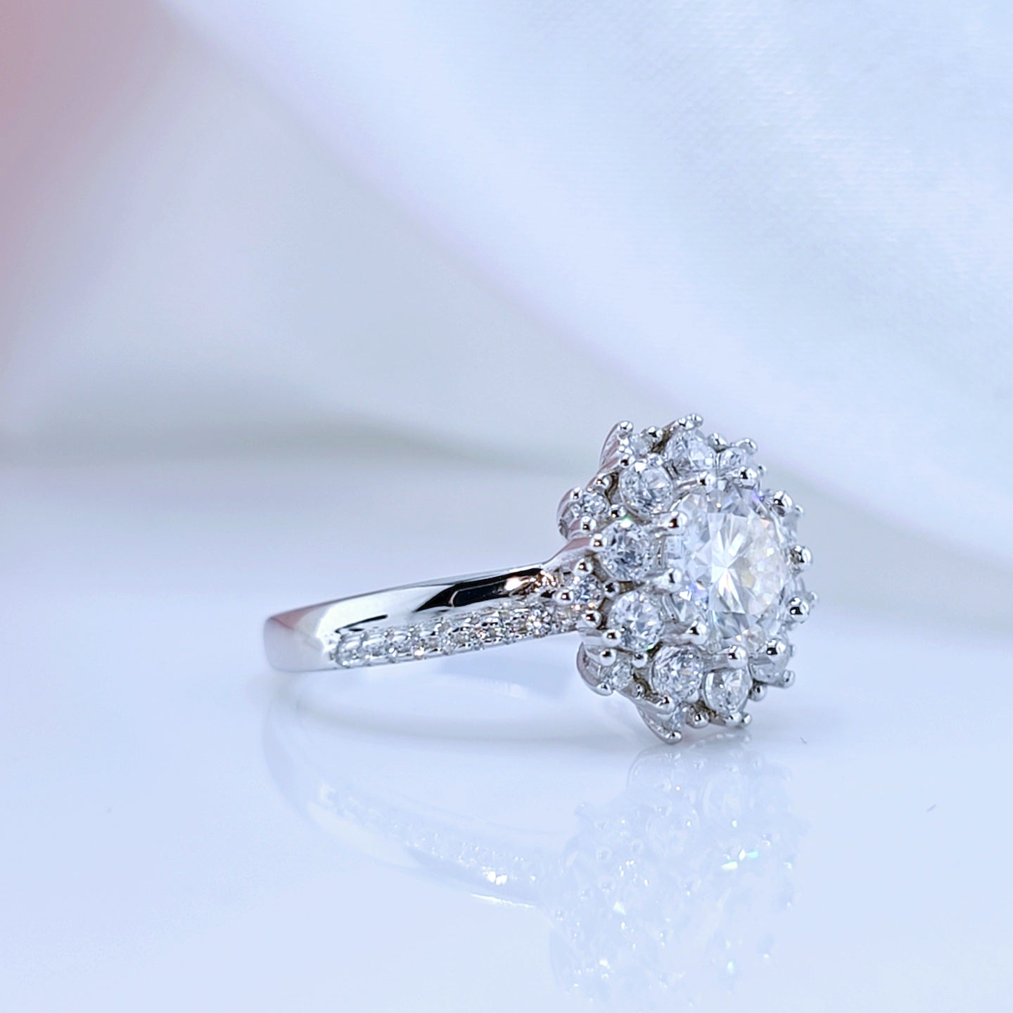 A stunning engagement ring featuring a certified 1ct moissanite center stone with VVS1 clarity and D color. The delicate flower design offers timeless elegance at an accessible price point, making it an ideal choice for those seeking quality and beauty without compromise.