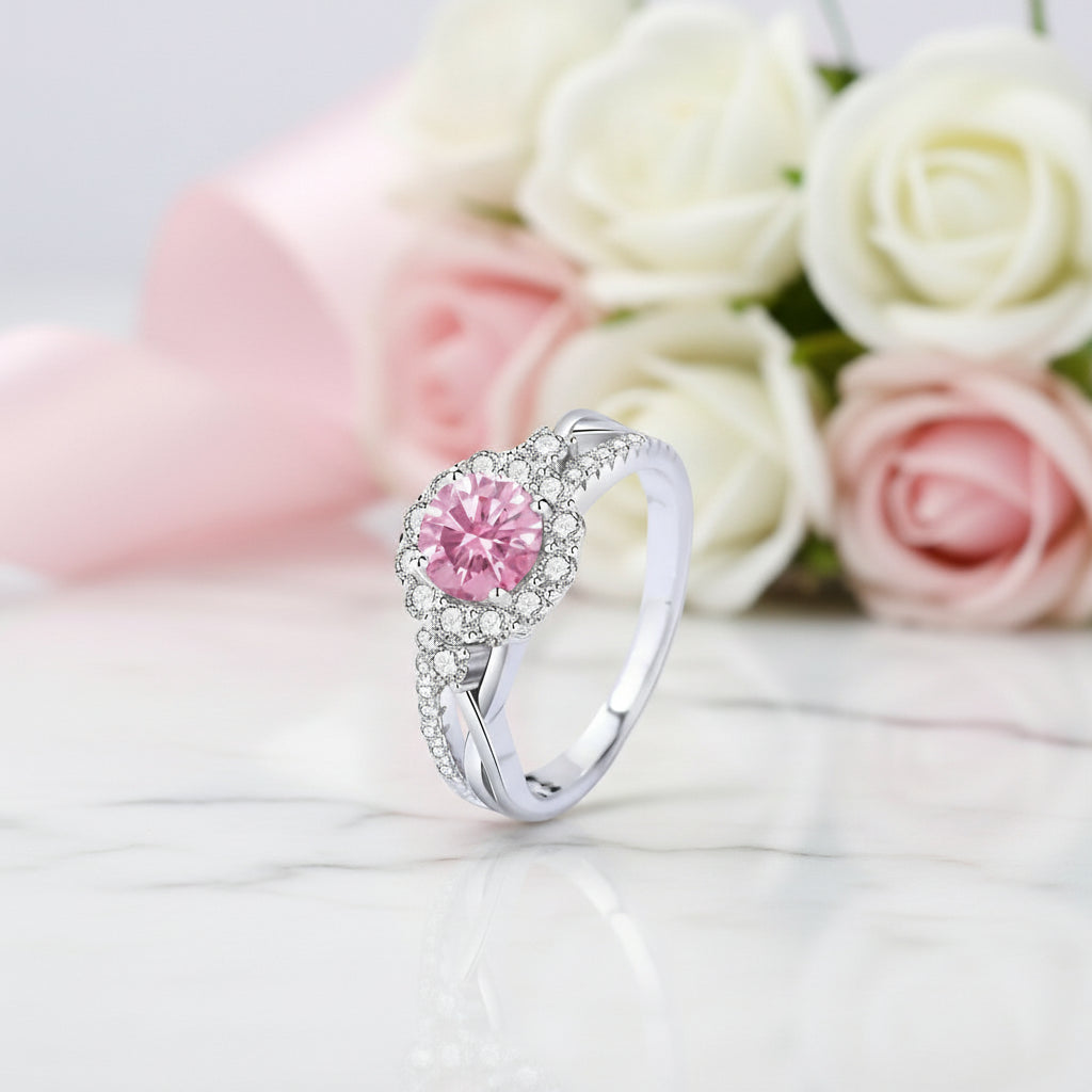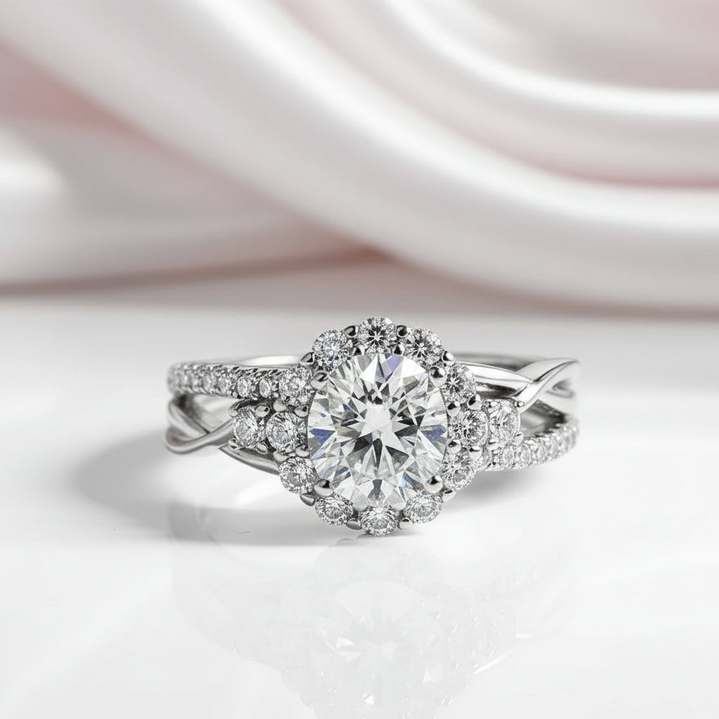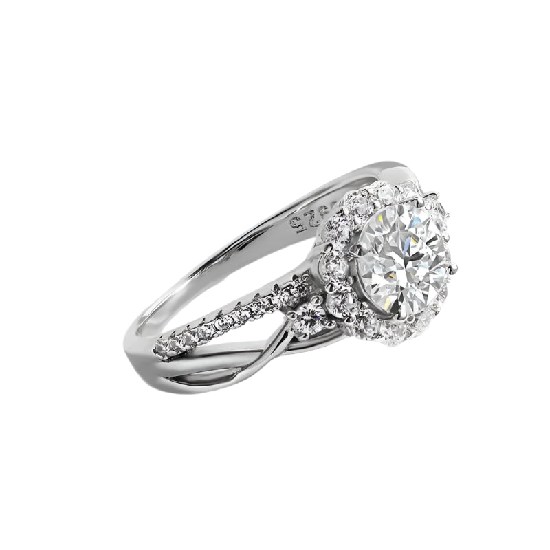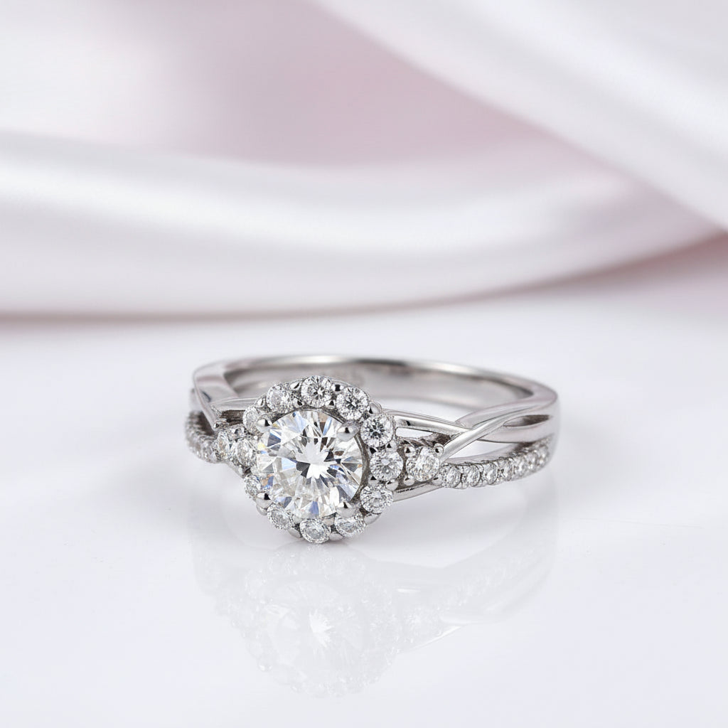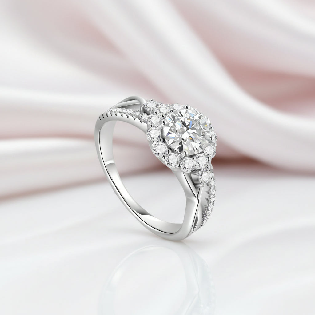 Stunning 1.0 Ct Certified Moissanite engagement ring featuring a round cut stone surrounded by a dazzling halo. Crafted with 925 silver dipped 5x in 18k white gold, this split shank design offers exceptional quality and brilliance at an accessible price point. The perfect symbol of your commitment without compromising on elegance.