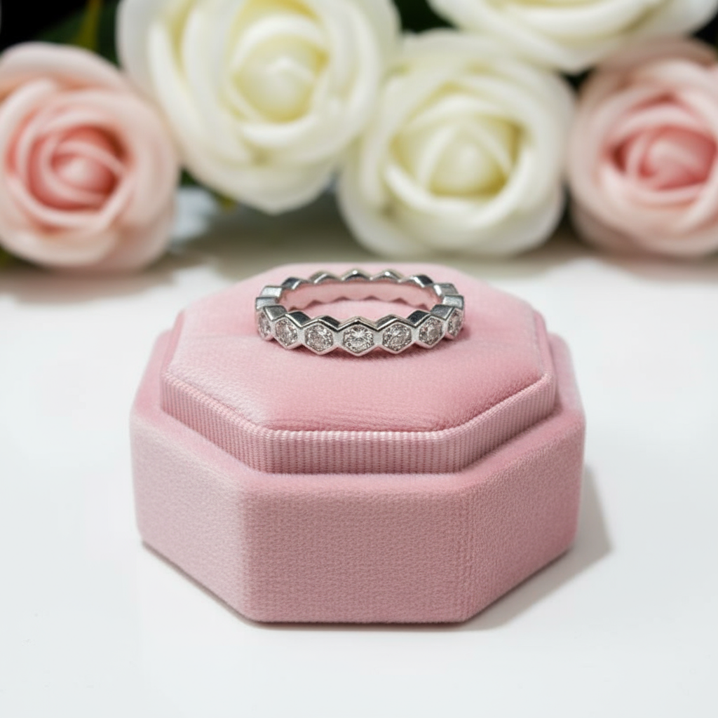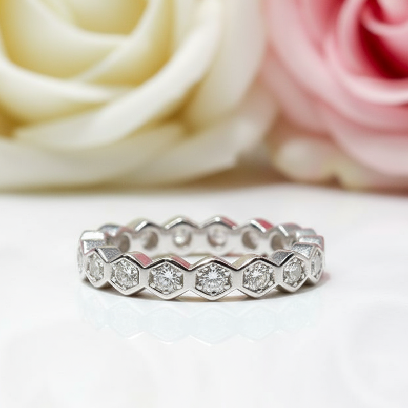 Own the spotlight with our 1.0 Ct Round Cut D Color Certified Moissanite Honeycomb Shape Wedding Band by Black Diamonds New York. This show-stopping band is designed to impress, featuring a flawless moissanite stone in a stunning honeycomb shape. The 925 silver setting, plated multiple times in Platinum, adds a touch of glamour and sophistication. Indulge in luxury without breaking the bank - our affordable yet high quality band is the perfect choice for brides who want to shine bright on their special day.