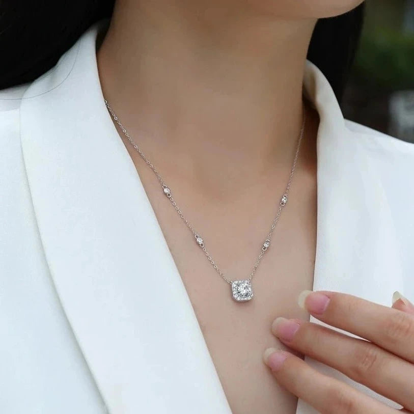 Make a statement in style with this gorgeous 1.0 Ct Round Cut Certified Moissanite Halo Necklace from Black Diamonds New York. The shimmering halo frame enhances the beauty of the center stone, creating a look that is both elegant and chic. Crafted with high quality 925 silver dipped 5x in 18k gold, this necklace is a must-have for anyone looking for a stunning yet affordable accessory.
