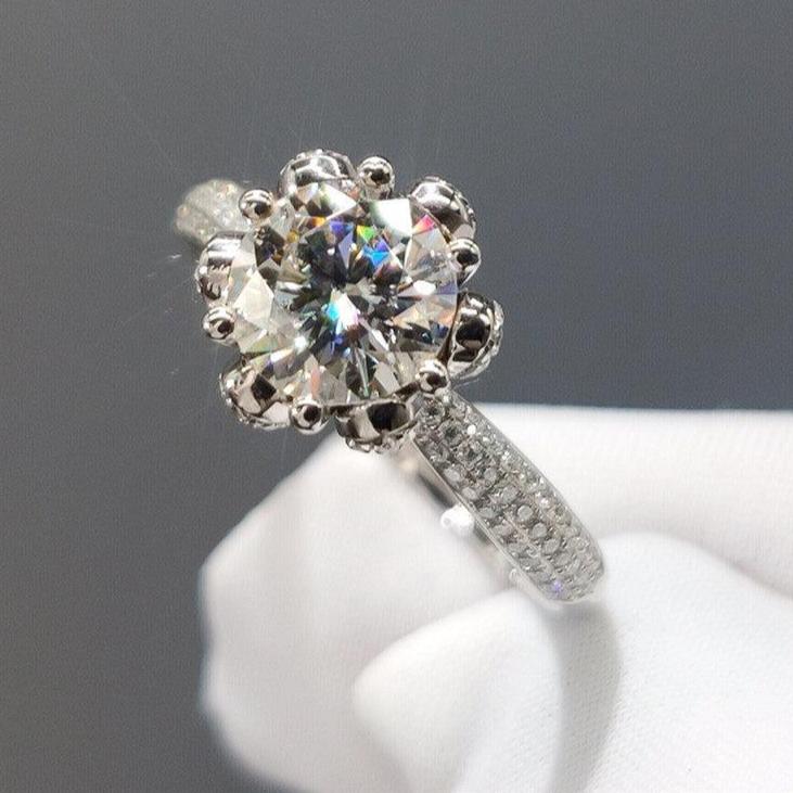 Make a statement with our exquisite 1.0 Ct Round Cut Certified Moissanite Snow Queen Engagement Ring. This stunning ring showcases a round cut moissanite in a pristine D color grade, radiating beauty and charm. Crafted from high-quality 925 silver that has been dipped multiple times in Platinum, this ring is both affordable and top-notch. Treat yourself to this gorgeous and sparkly piece that will surely take your breath away.