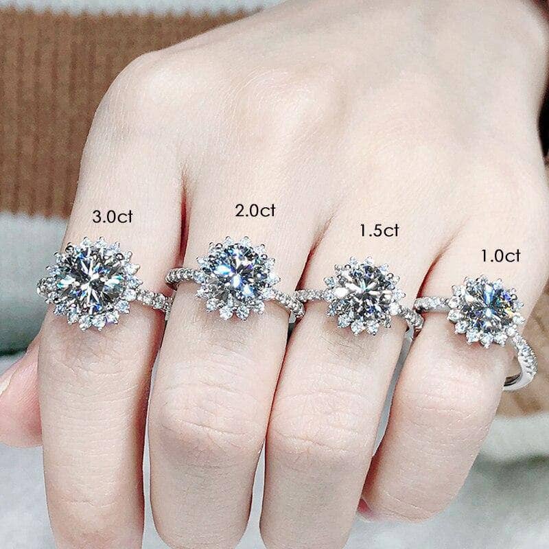 Indulge in the breathtaking beauty of this 1.0Ct 6.5mm VVS1 Diamond Sun Flower Engagement Ring. Crafted from 925 sterling silver, featuring a stunning certified moissanite center stone in a captivating round cut, with a pure and radiant D color. The intricate prong setting highlights the brilliance of the main stone while the shimmering created diamonds add a touch of sparkle. Elevate your love and devotion with this exquisite piece.