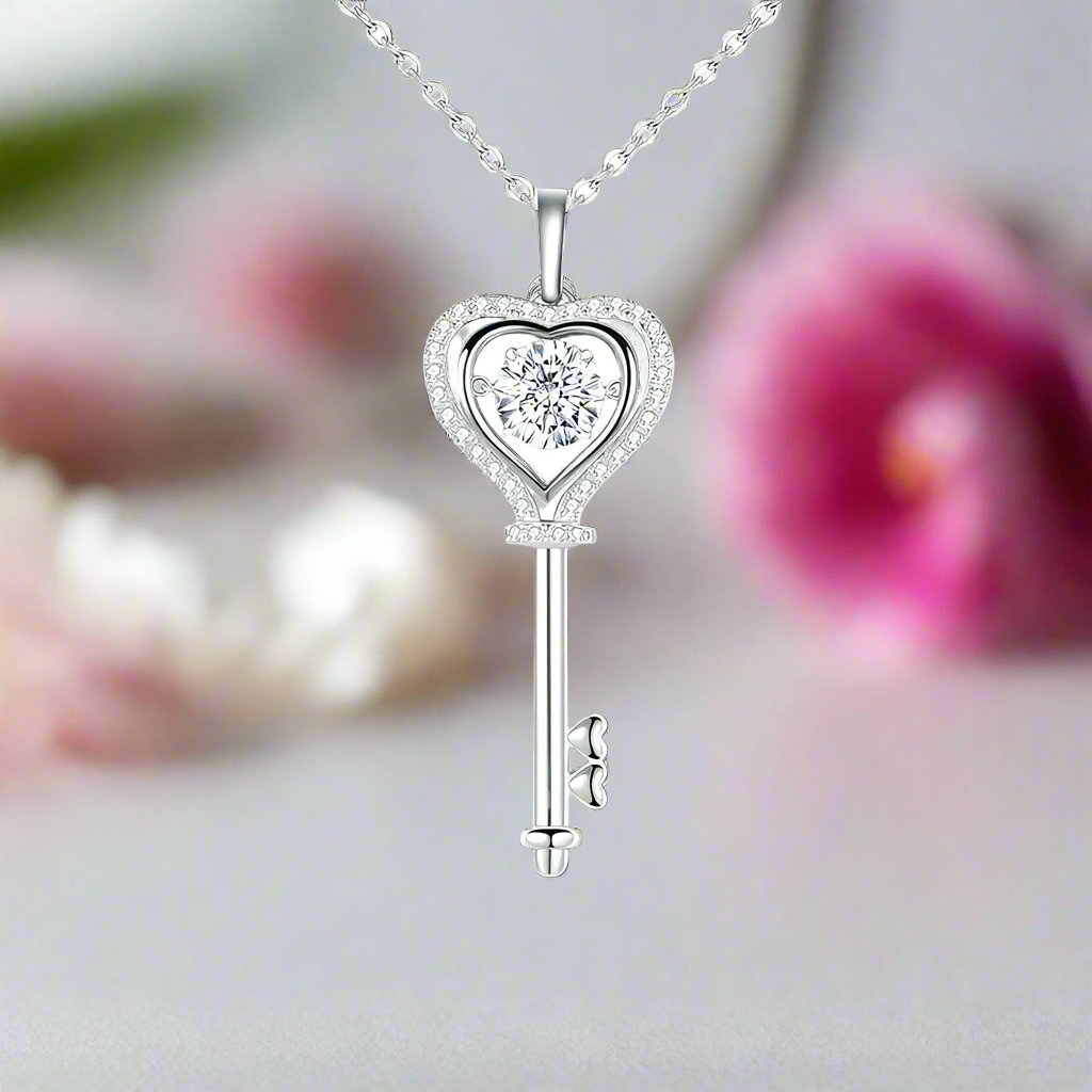 The 1.0 ct Diamond Heart Key Pendant Necklace showcases a high-quality Certified Moissanite, elegantly set in sturdy 925 Sterling Silver. Meticulously handcrafted, it embodies enduring sophistication and exceptional craftsmanship.