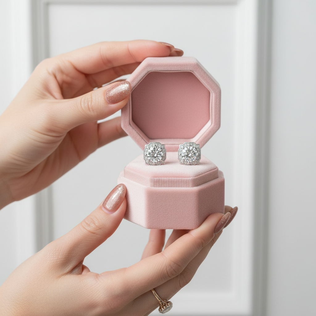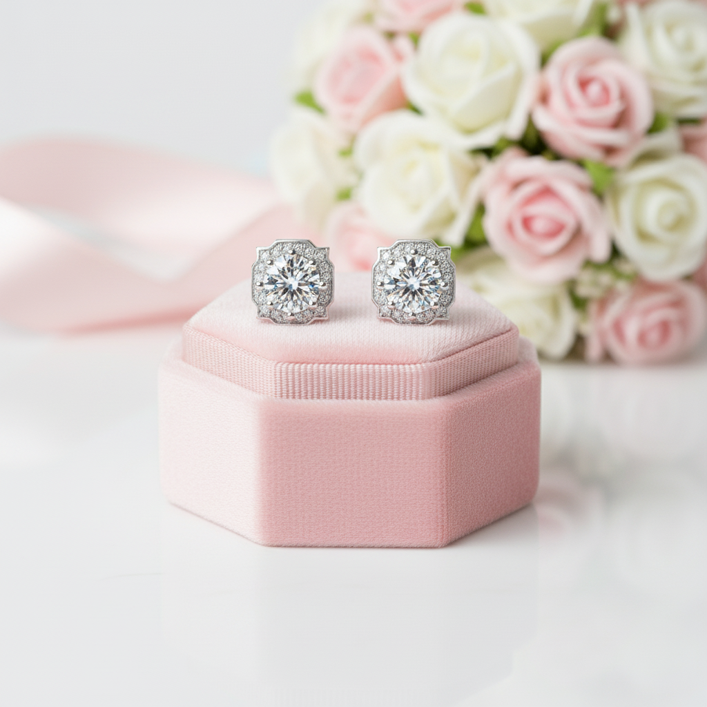These 1.0ct Round Cut Diamond Halo Stud Earrings are meticulously handcrafted to deliver outstanding brilliance and enduring sparkle. Featuring a premium Certified Moissanite stone, they embody timeless elegance and refined craftsmanship.