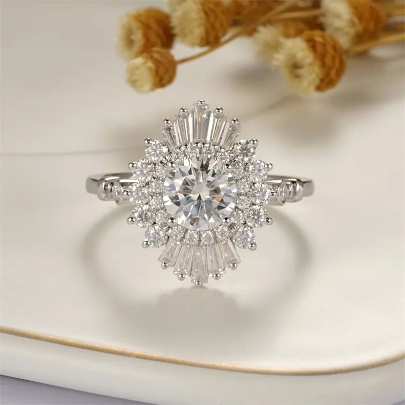 Fall head over heels for the sheer brilliance of the 14k White Gold 1.0 Ct Certified Moissanite Vintage Baguette Engagement Ring by Black Diamonds New York. Its radiant round cut moissanite centerpiece shines with unmatched clarity, exuding a captivating allure. The delicate vintage baguette accents gracefully adorn the 14k white gold band, adding a touch of nostalgic charm. From its impeccable craftsmanship to its affordable price, this ring radiates elegance and pays homage to timeless beauty. Let its sparkly beauty tell your unique love story, making every moment together as enchanting as the day you said "yes".