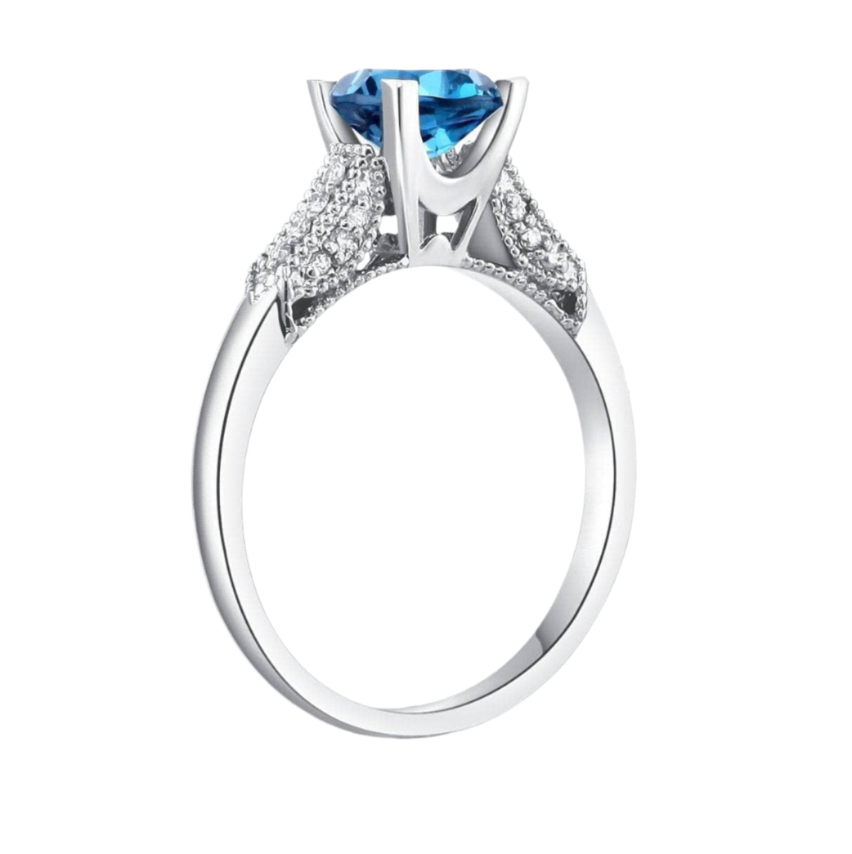 Luxury takes on a new form with this exquisite 14k White Gold 1.2 Ct London Blue Topaz & Natural Diamond Ring. Its eye-catching 1.2ct round cut blue topaz center stone is wonderfully complemented by beautiful side stones of round cut diamond with a stunning sparkle. Exquisite craftsmanship and high quality materials make it an affordable and timeless piece for the modern fashionista.
