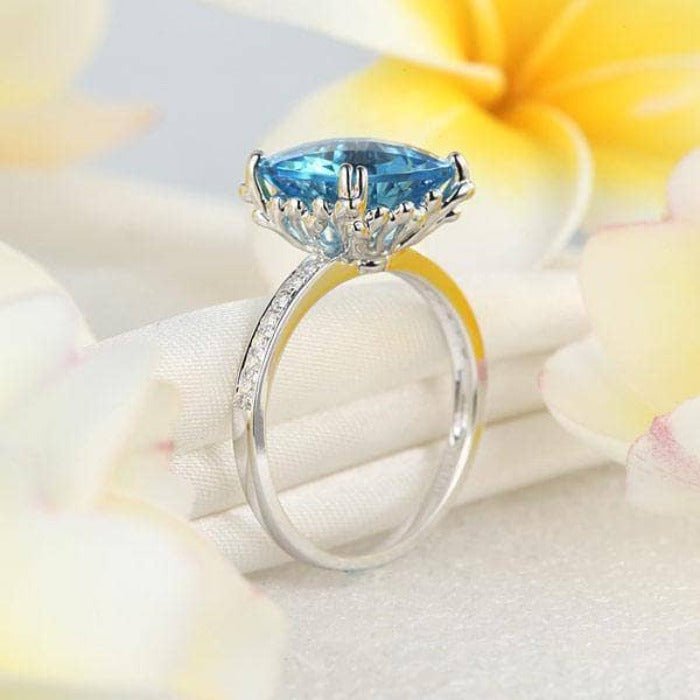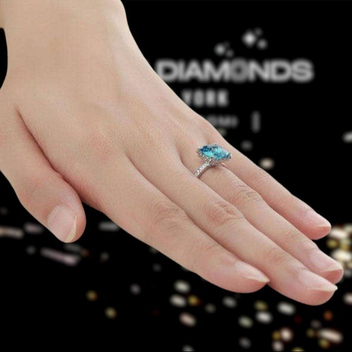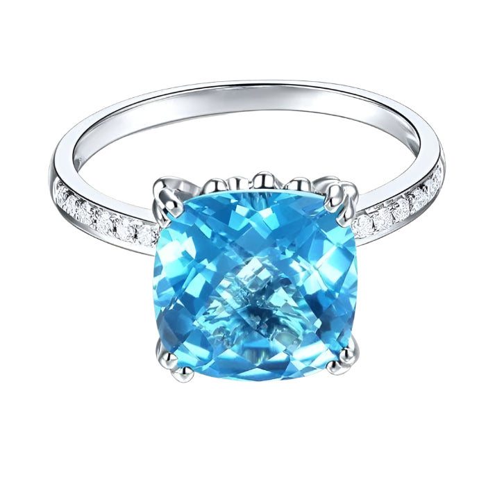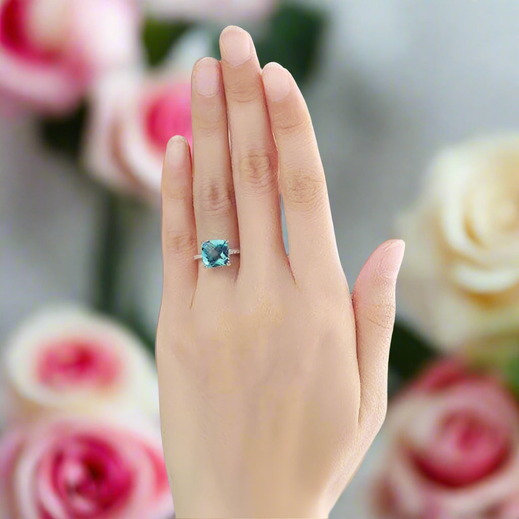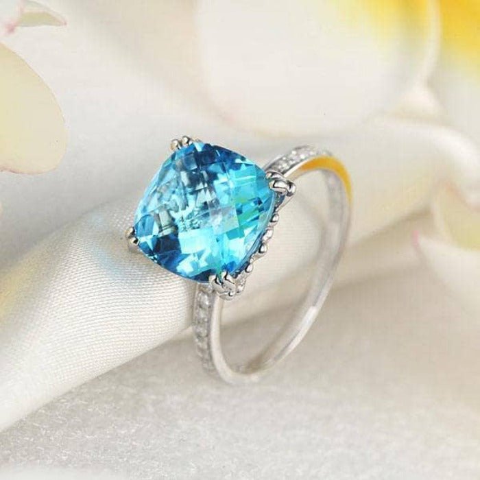 Elevate your loved one's jewelry collection with this stunning 14k white gold 4.5ct cushion cut Swiss Blue Topaz Natural Diamond ring. Its high-caliber craftsmanship ensures a luxurious and sophisticated look, while the gorgeous band stones and sparkling details add a dose of glamour. An affordable and eye-catching piece – perfect for any special occasion.