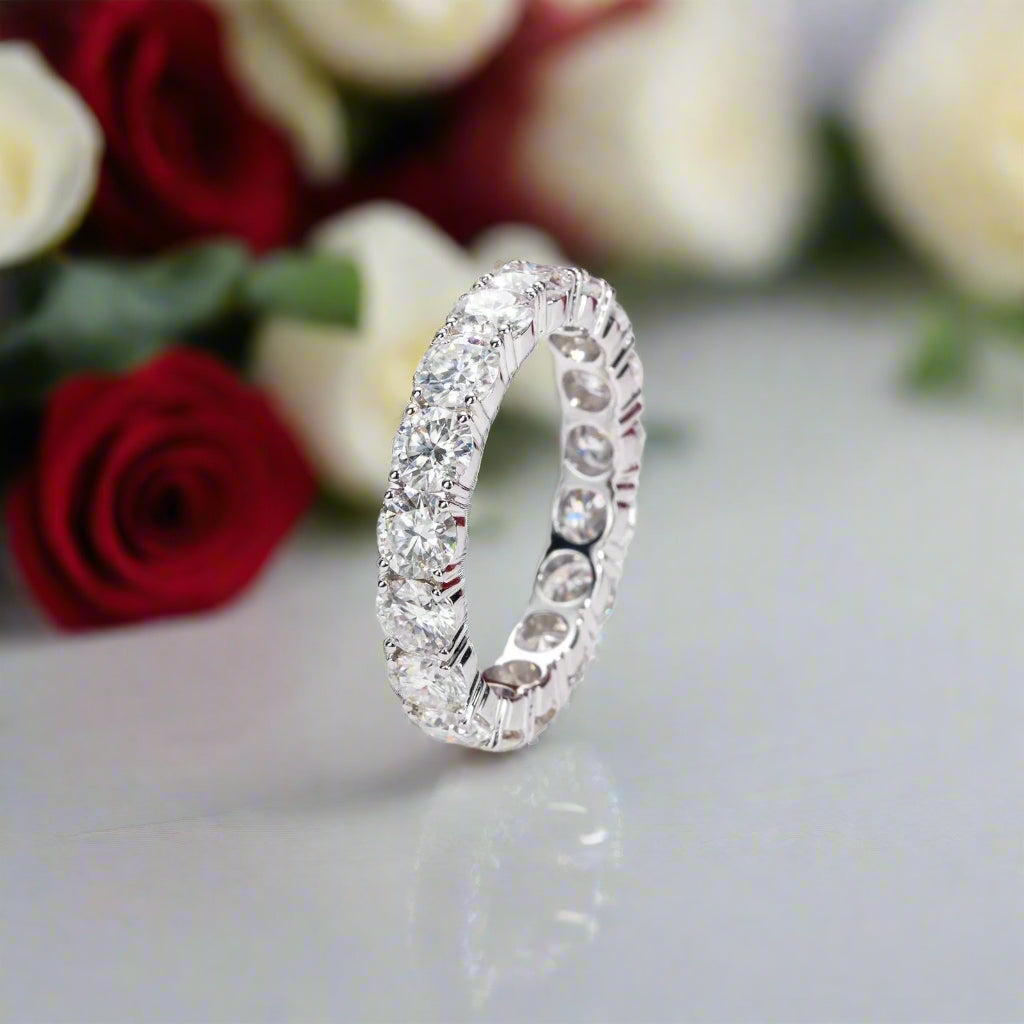 Luxurious 14k white gold eternity band featuring 5 carats of brilliant moissanite stones. Expertly crafted with 925 silver dipped in 18k gold for exceptional quality at an affordable price. A stunning symbol of eternal love that captures attention from every angle.