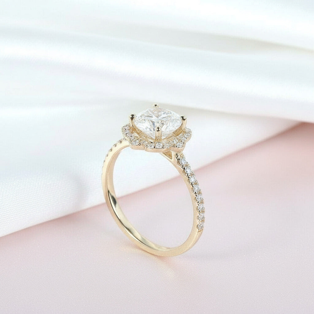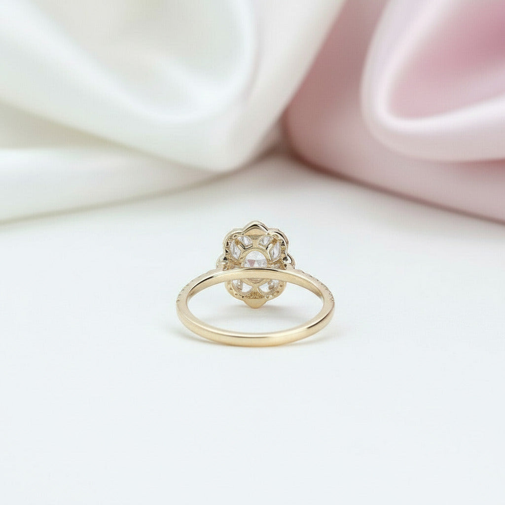 14K Yellow Gold 1.5ct Oval Cut Flower Halo Engagement Ring