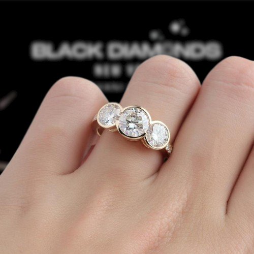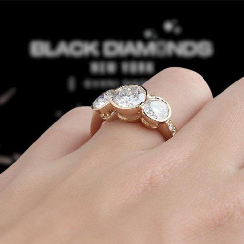 Feel beautiful, no matter the occasion, with this 14k Yellow Gold 3.1 Ctw Round Certified Moissanite Three Stone Engagement Ring by Black Diamonds New York. Exquisitely crafted to perfection, it has a brilliant round-cut center stone and two round-cut side stones, creating a stunningly shimmering effect. You can enjoy this beautiful piece all for an affordable price, ensuring a high-quality look for your cherished event.