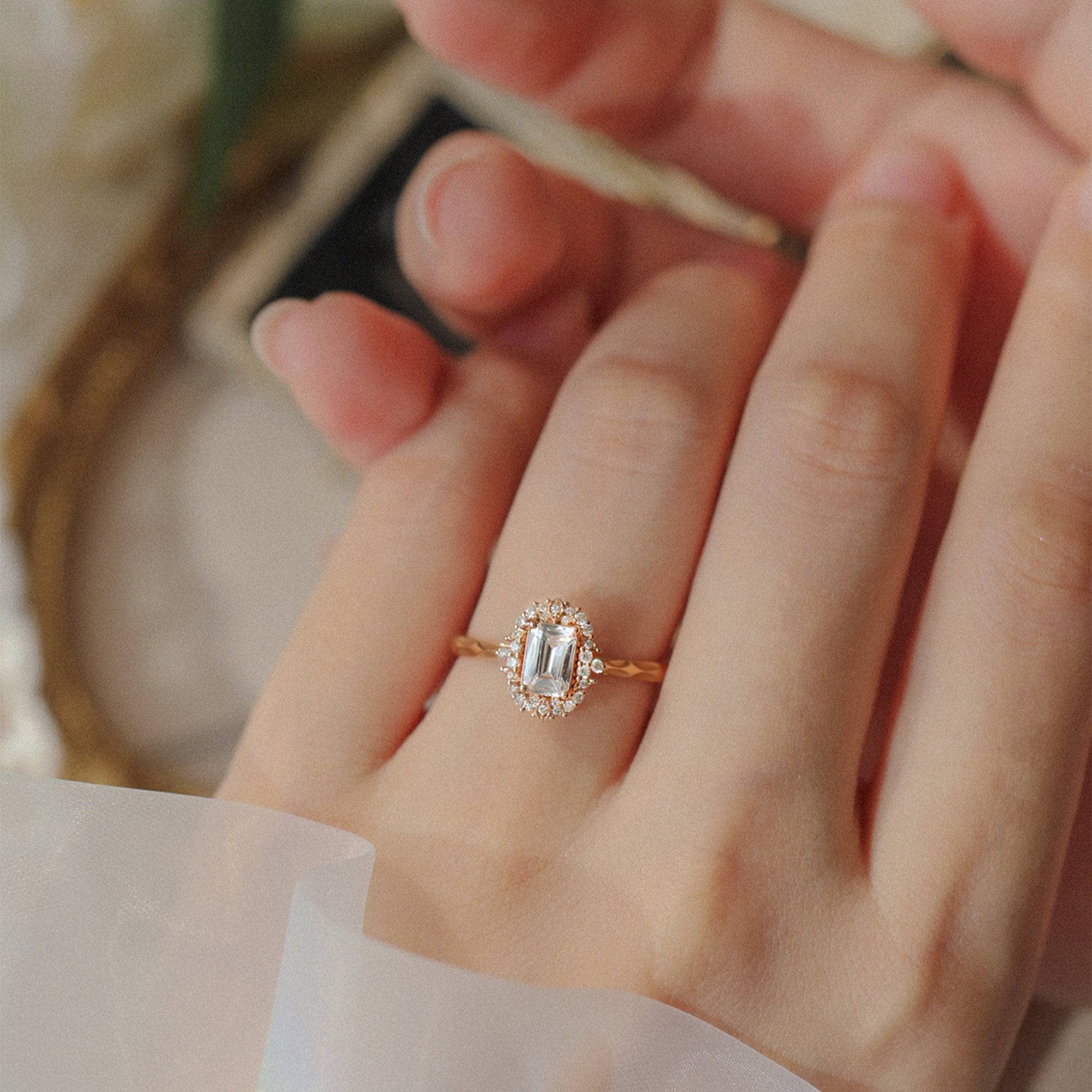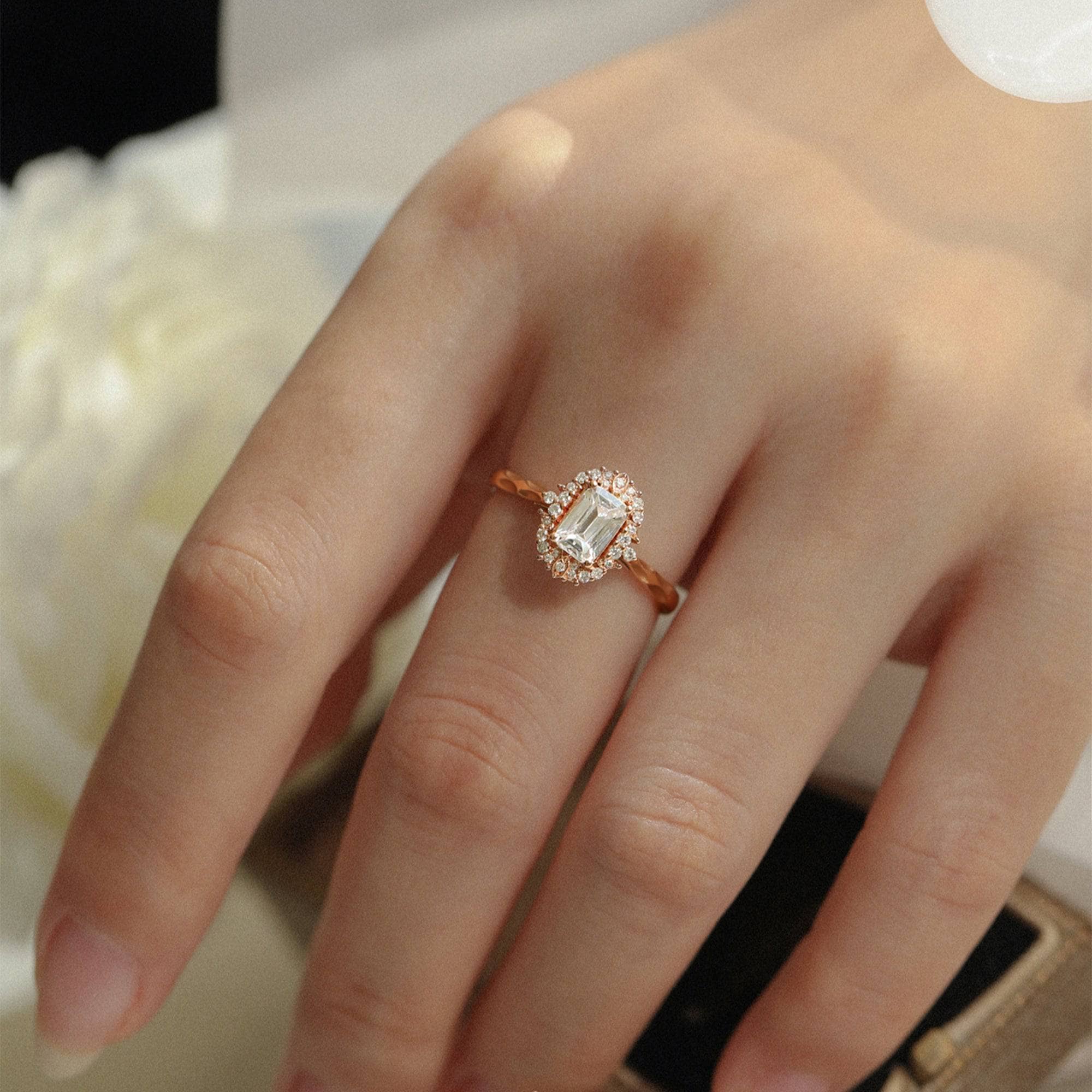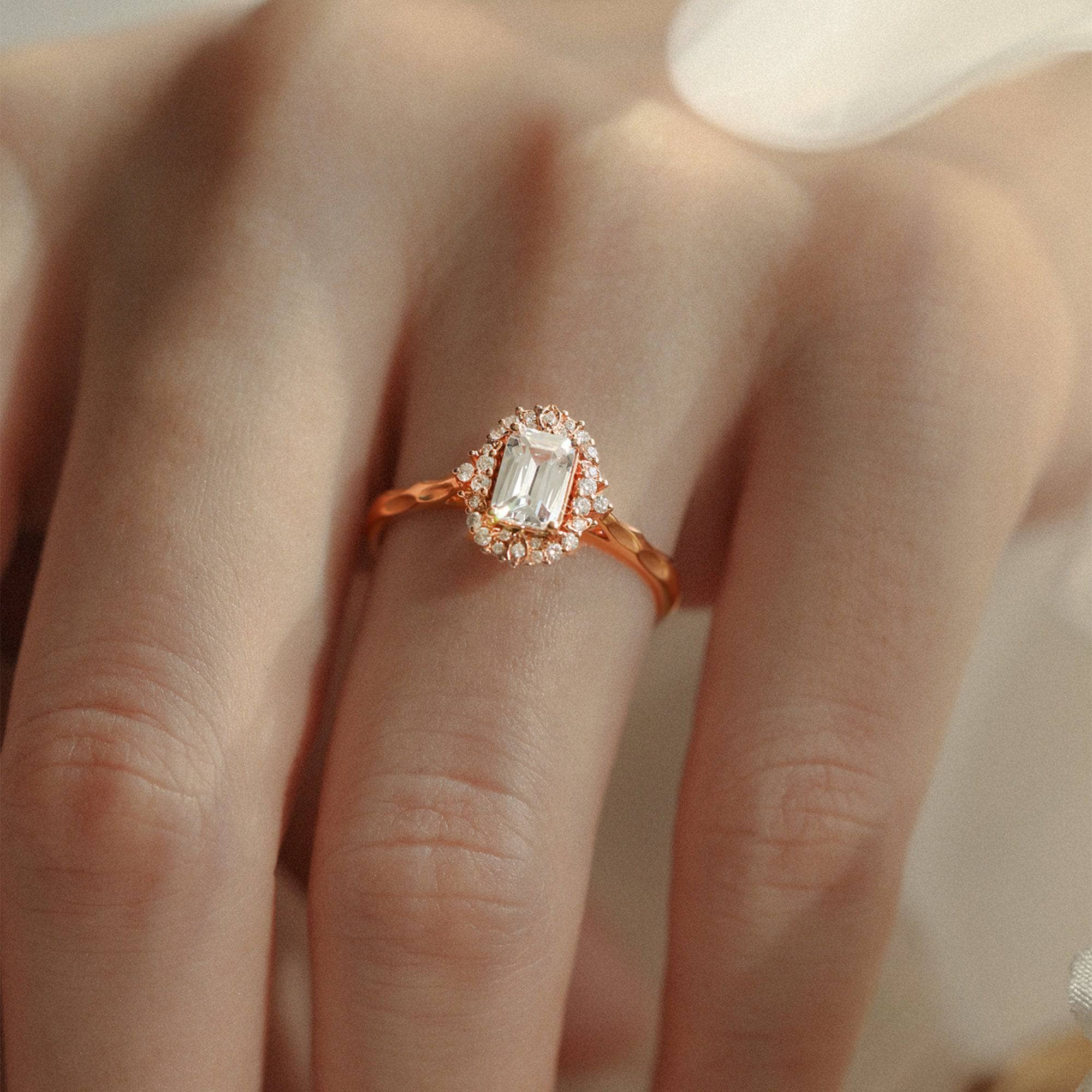 18k Art Deco Emerald Cut Certified Moissanite Rose Gold Engagement Ring