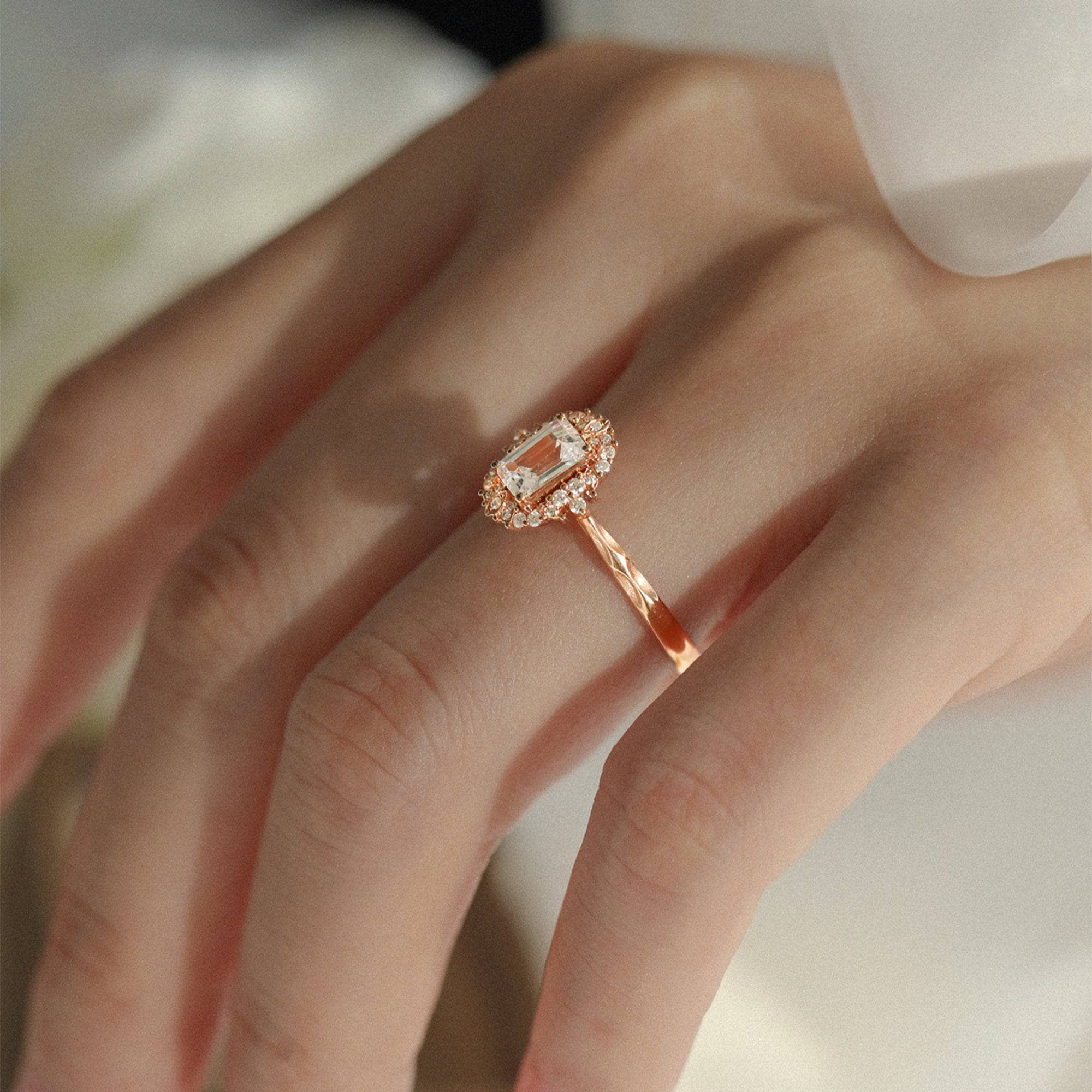 18k Art Deco Emerald Cut Diamond Rose Gold Engagement Ring