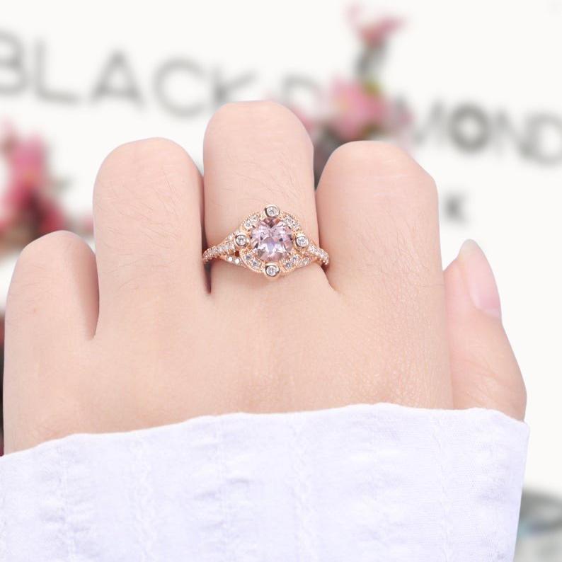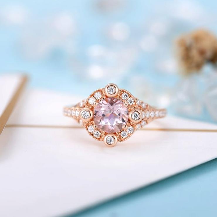 18k Rose Gold Center 6.5mm Morganite Milgrain Halo Engagement