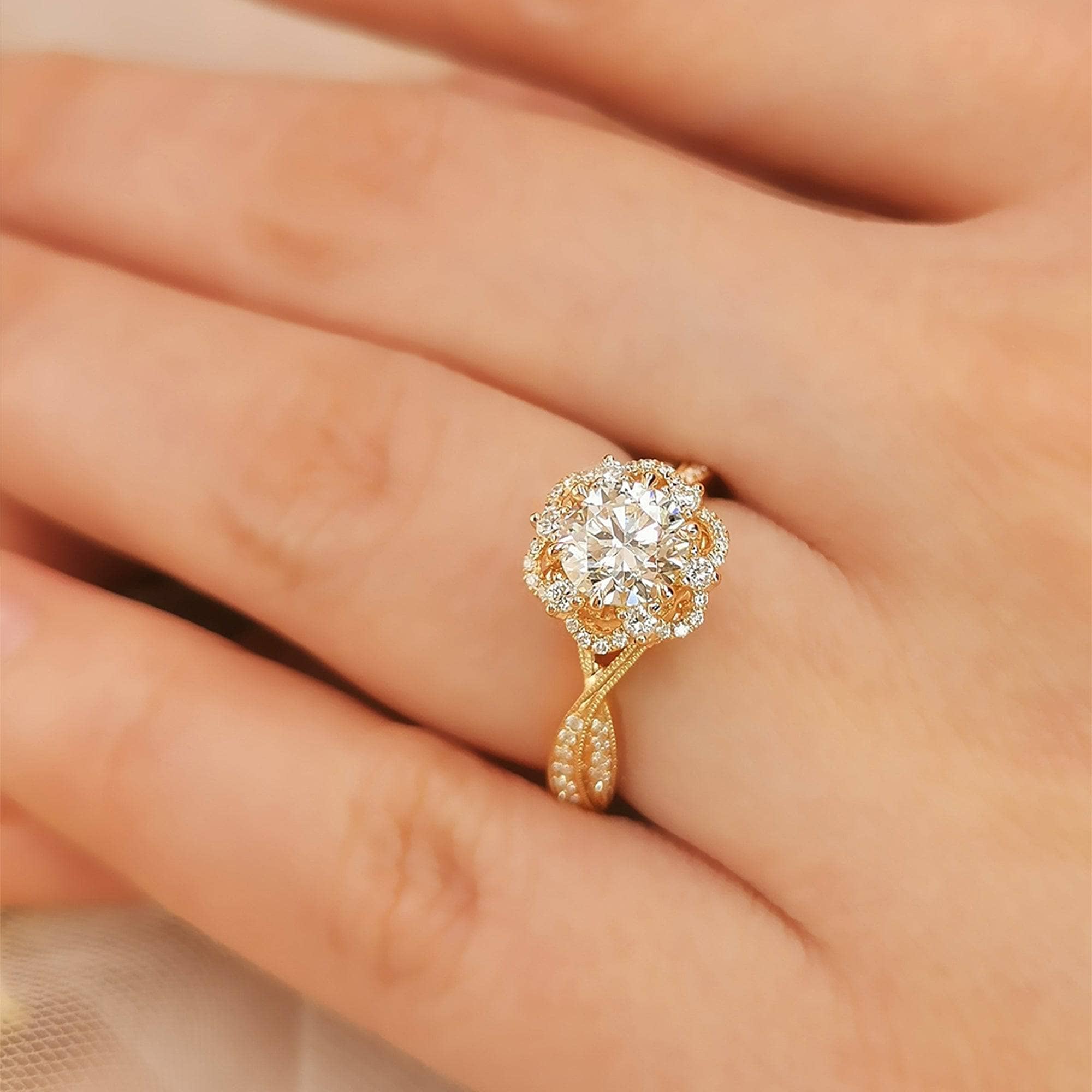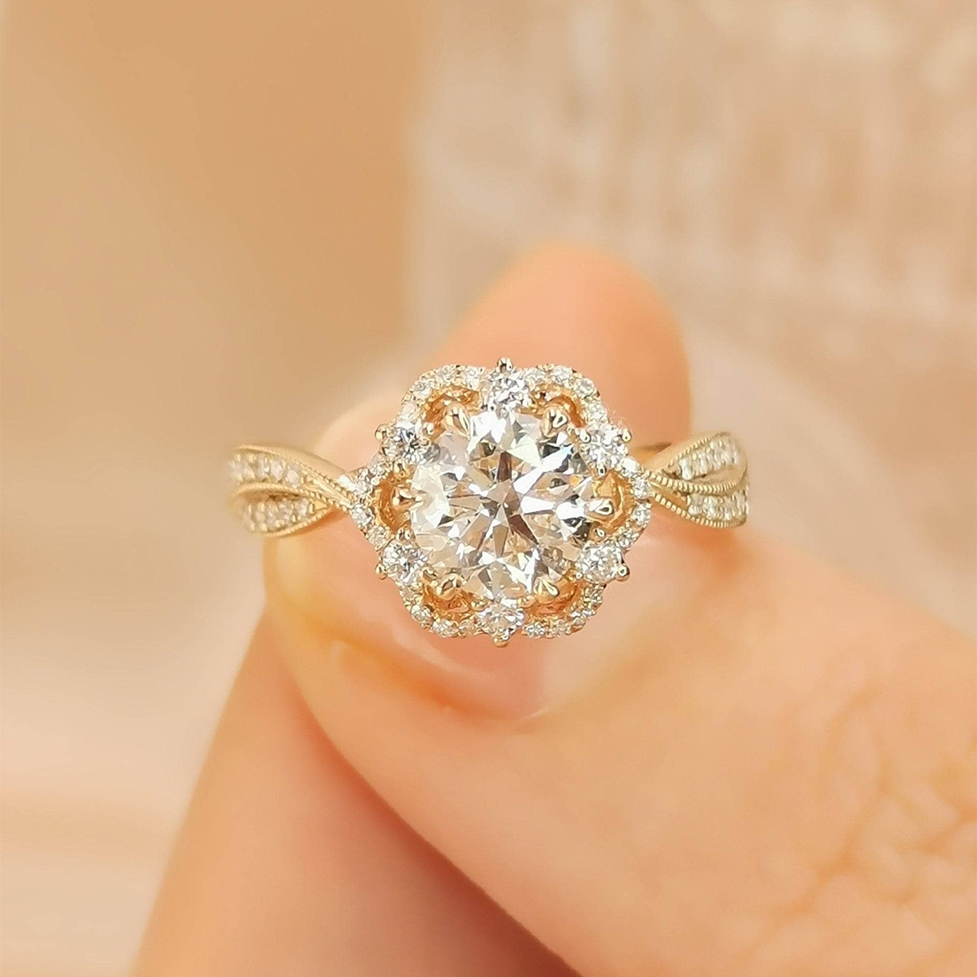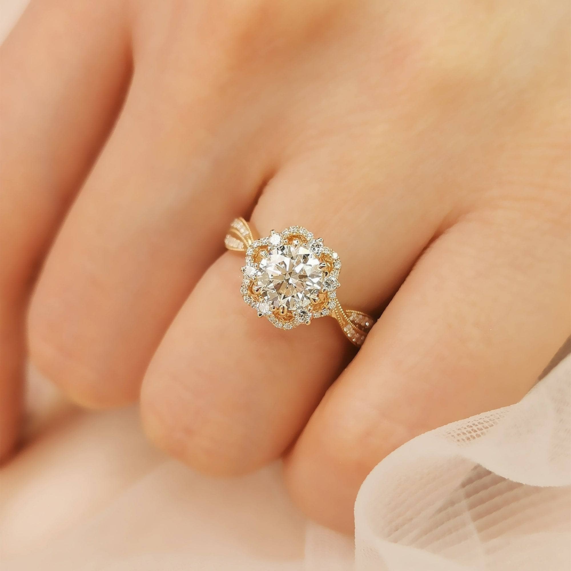 18k Round Cut Certified Moissanite Flower Art Deco Engagement Ring