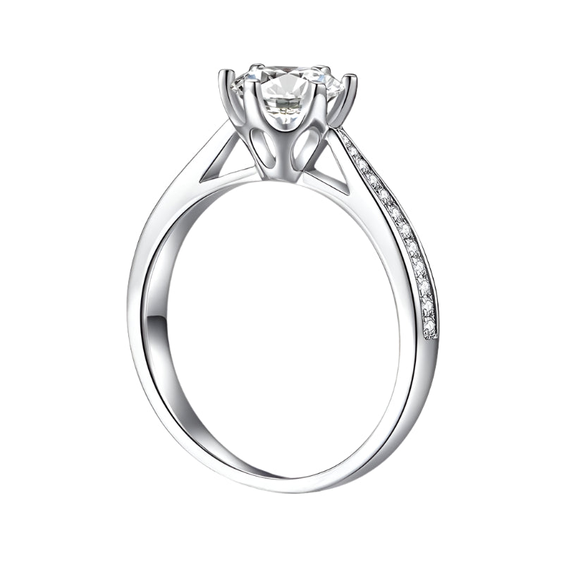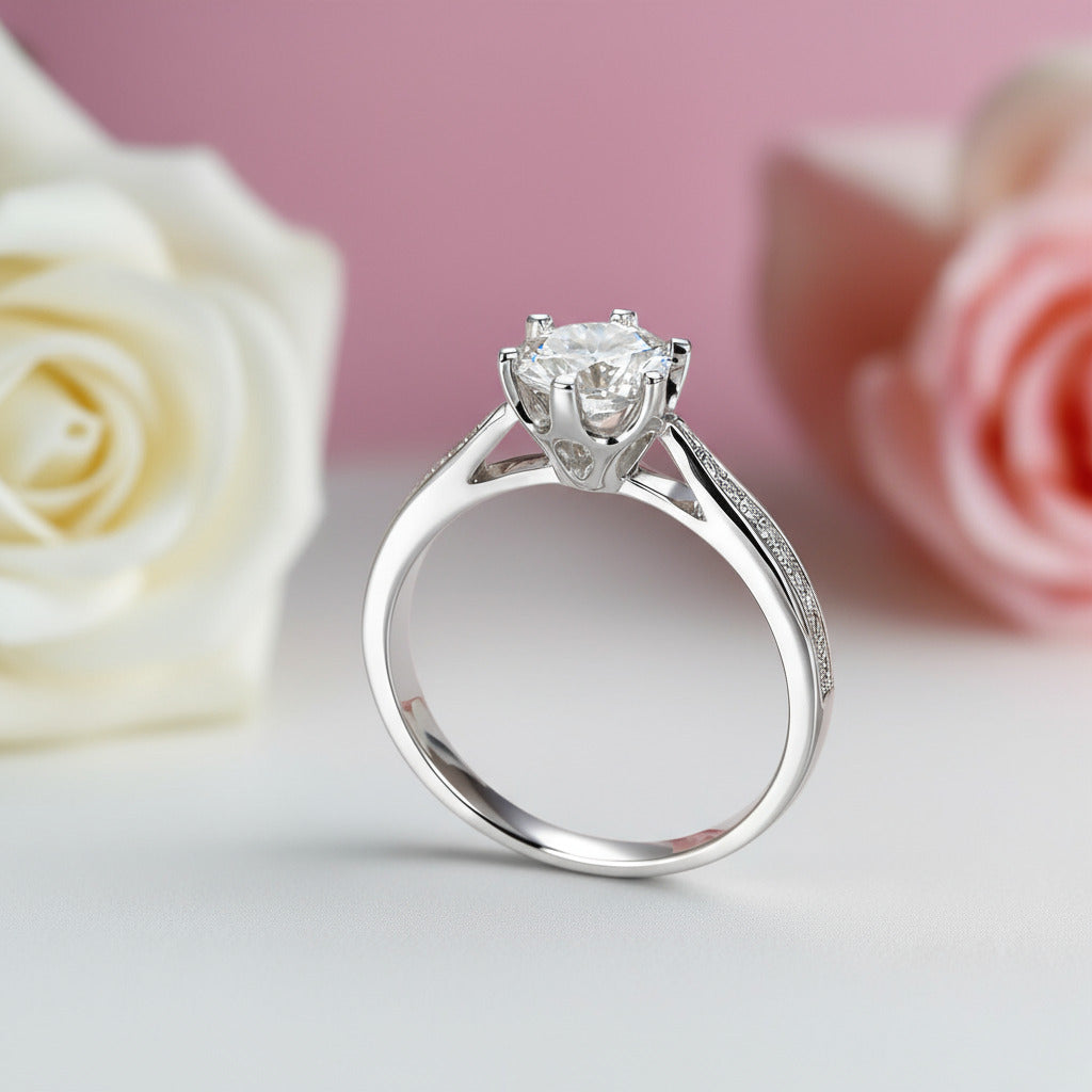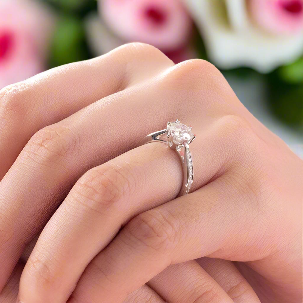 Made from the finest materials, this exquisite engagement ring crafted from top-quality Certified Moissanite and solid 925 Sterling Silver . Handcrafted to perfection to achieve exceptional brilliance and sparkle, it is a symbol of your love for each other and a testament to your unique and elegant style. Indulge in luxury and sophistication with this exclusive ring, designed to surpass all expectations.