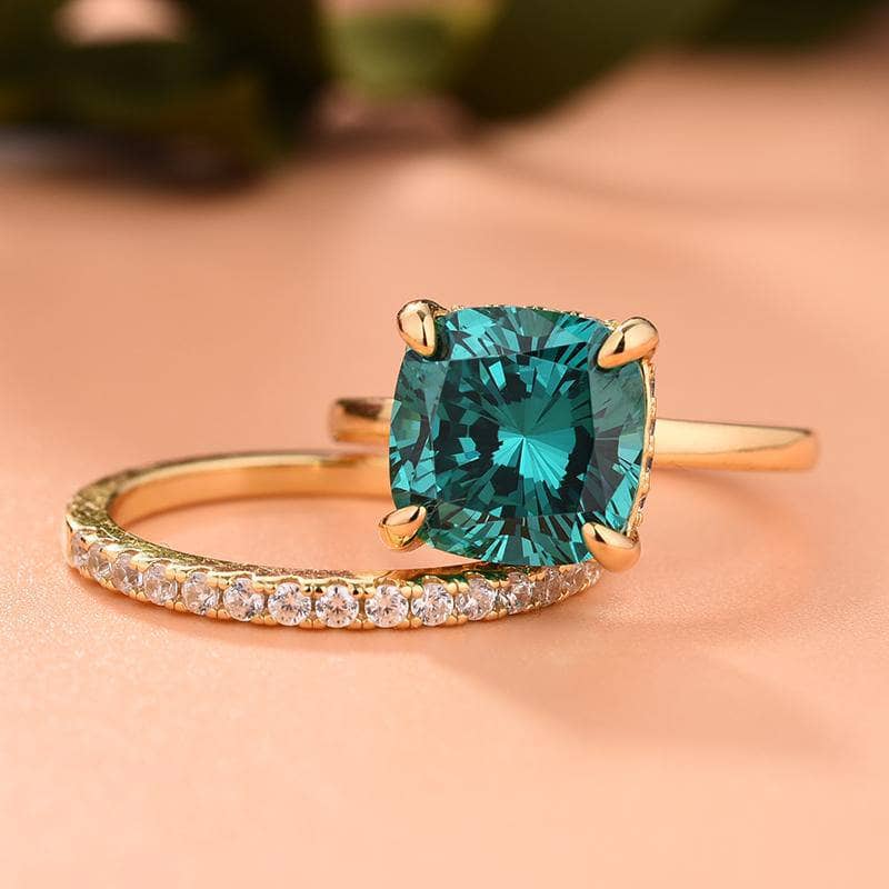 Luxury meets brilliance. This handcrafted Paraiba Tourmaline wedding set features a stunning 3.5-carat cushion-cut center stone surrounded by premium simulated diamonds for maximum sparkle and elegance.