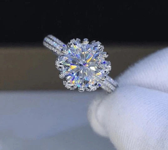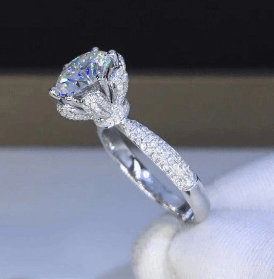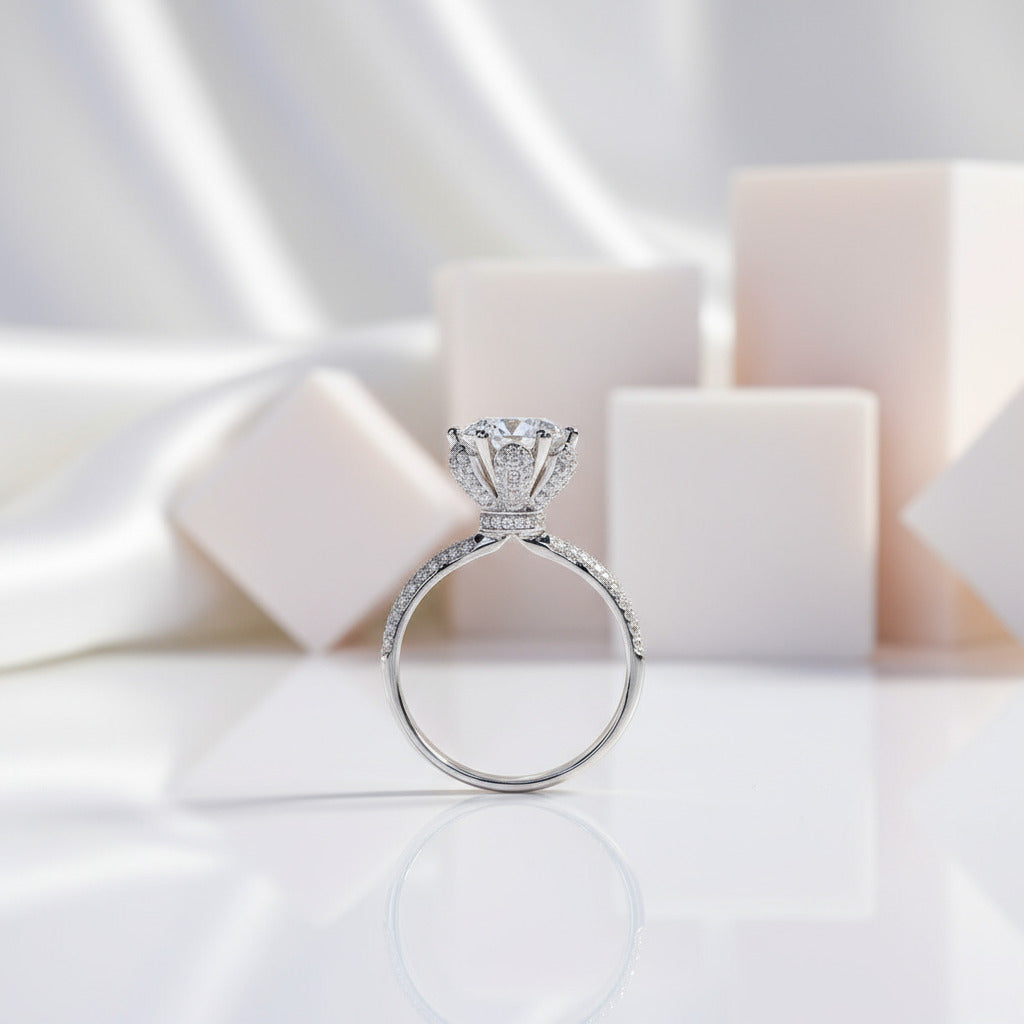 This 3ct Six Prong Bouquet Engagement Ring is meticulously handcrafted, embodying excellence beyond the 4Cs. Featuring premium diamonds at the heart of our Diamond Alternative, it is expertly designed to represent the timeless symbol of the most profound love story.