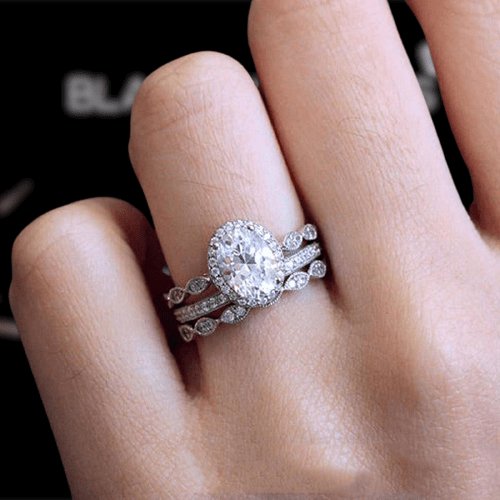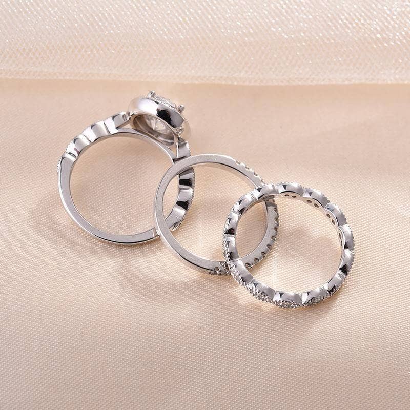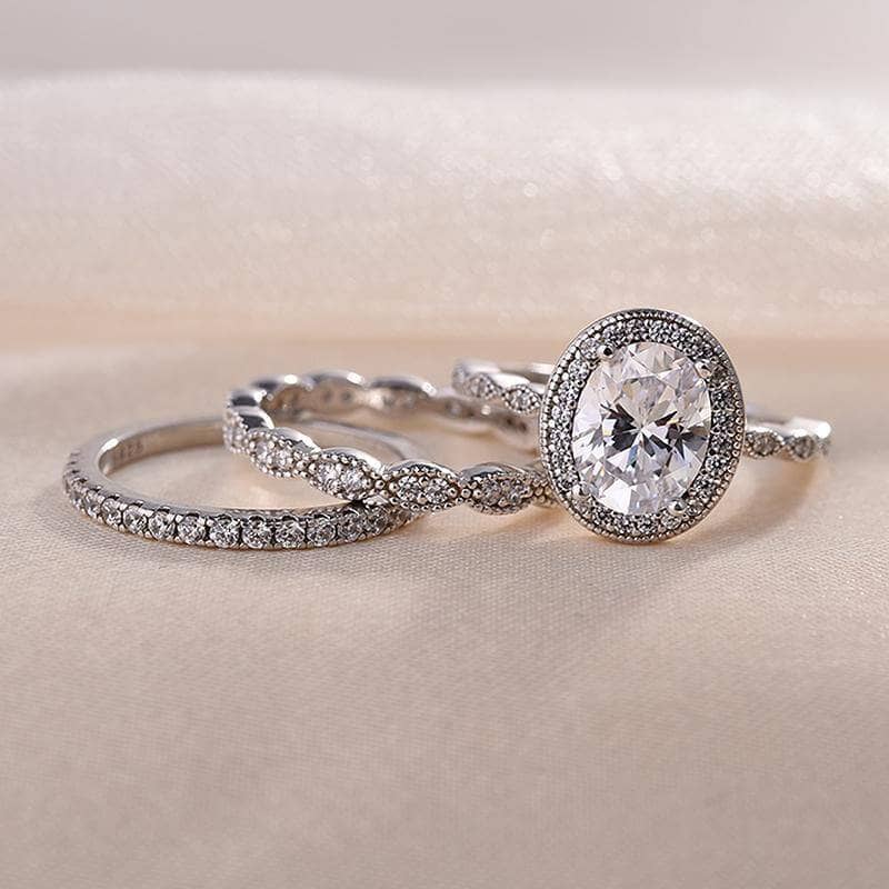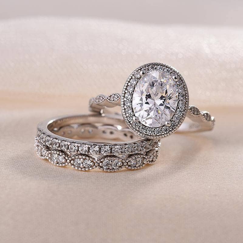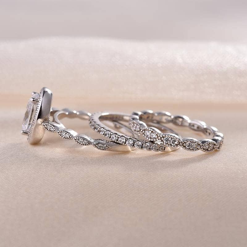 3pc Dainty Milgrain Art Deco Oval Cut Halo Bridal Set