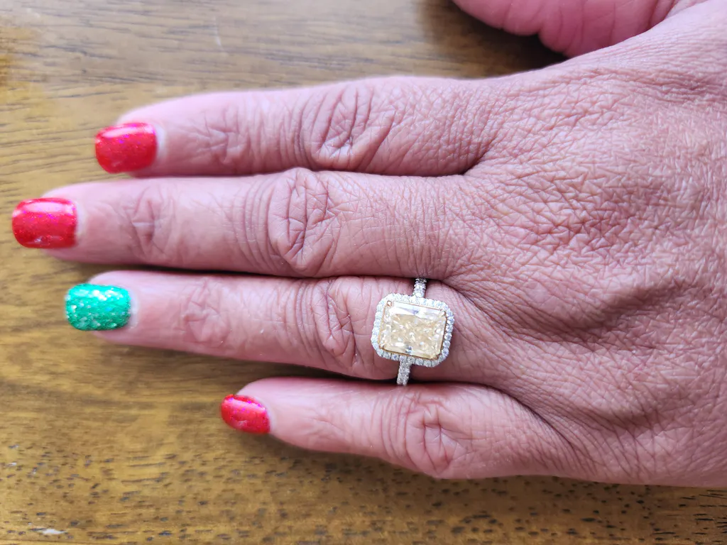 Introducing a stunning symbol of eternal love and commitment, the light yellow radiant cut engagement ring by Black Diamonds New York. Expertly crafted in lustrous 14k white gold, this exquisite ring boasts a captivating centerpiece, a brilliant 4.0 ct radiant cut stone. Its rare light yellow hue radiates warmth and elegance, elevating its allure to new heights. Ensuring an unforgettable proposal, this luxurious ring is guaranteed to elicit a resounding "YES" from your beloved.