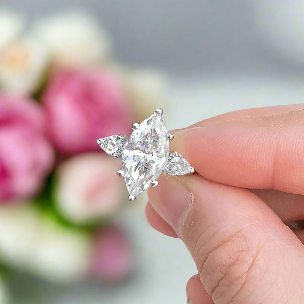 This 4.0 Ct Marquise Cut Moissanite Engagement Ring blends timeless sophistication with exceptional craftsmanship. Featuring a dazzling moissanite centerpiece set in 925 silver layered five times with 18k white gold, it offers lasting brilliance and elegant design at an accessible price. Perfect for celebrating enduring love with refined style.