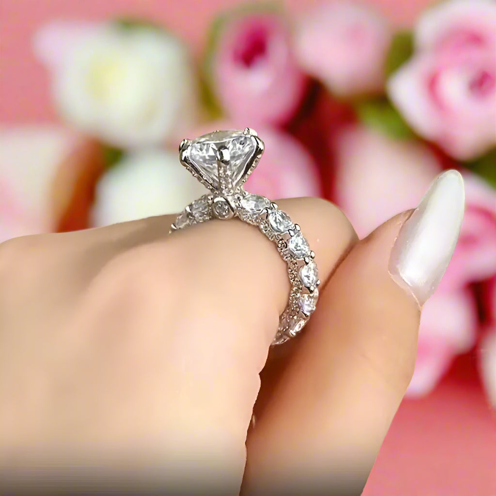 Indulge in the ethereal beauty of our 4.0 Ct Round Cut Certified Moissanite Engagement Ring, a true testament to love's brilliance. The exquisite 4 carat round cut moissanite centerpiece is expertly crafted to captivate with its mesmerizing sparkle and fire. Skillfully set in a band of 925 silver meticulously dipped five times in 18k white gold, this ring showcases superior craftsmanship and a truly luxurious finish. With its high quality and affordable price, you can now adorn yourself with a ring that exudes elegance and sophistication. Experience the magic of this lustrous and breathtaking piece, designed to make your heart skip a beat.