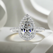 Say yes to a timeless beauty that's inspired by celebrity engagement rings. Our 6.0 ct pear-cut moissanite halo white gold engagement ring is a breathtaking piece designed to steal hearts. Featuring a stunning pear-cut moissanite stone in a prong setting, this ring is crafted to radiate elegance and sophistication. The dazzling halo enhances the dimensions of the center stone and adds a dash of sparkle to the look. Made with high-quality white gold, this engagement ring is a perfect symbol of love and commitment!