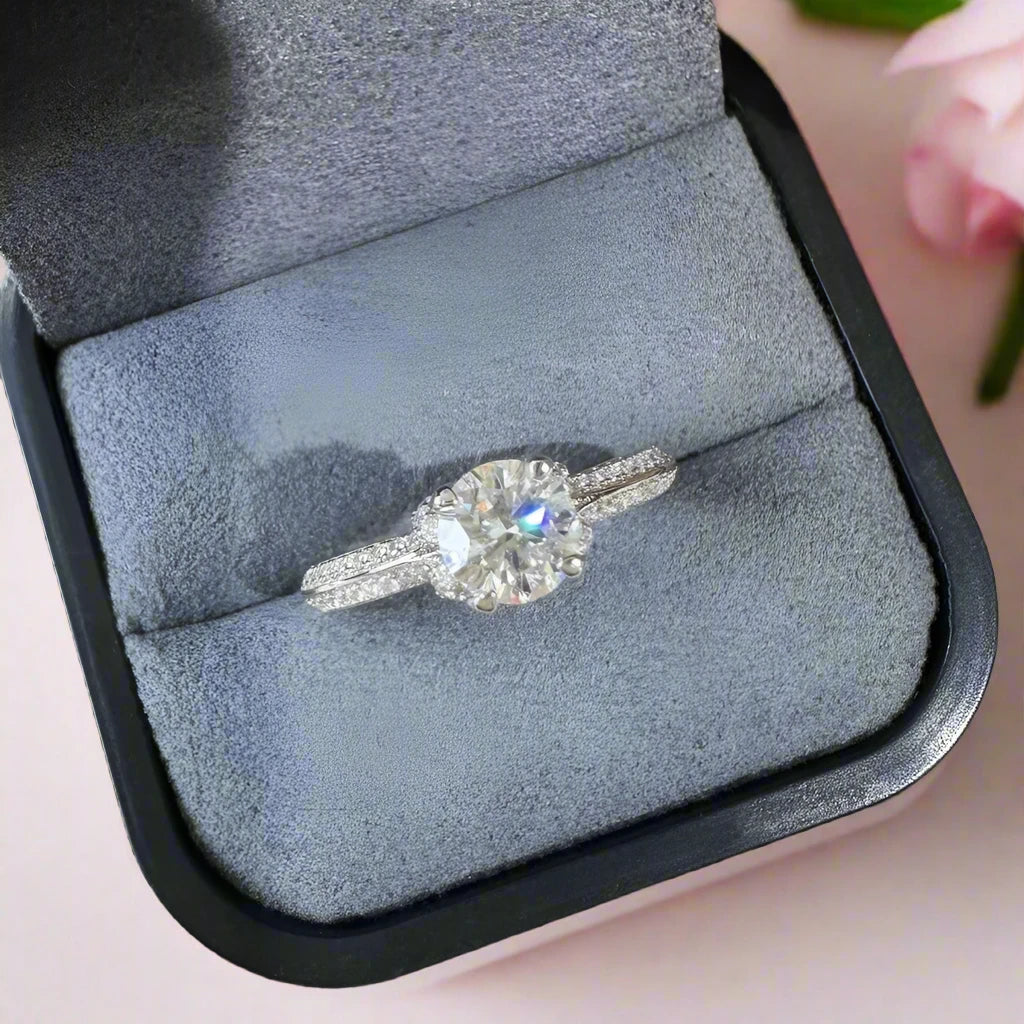 CERTIFIED MOISSANITE- stunning, near-colorless lab-grown gemstone (silicon carbide). Exhibits more fire (rainbow flashes) than diamonds. Hardness of 9.25 (Mohs scale), highly durable for daily wear. D-F color, VS1 Clarity, certified by GRA with a unique girdle code.