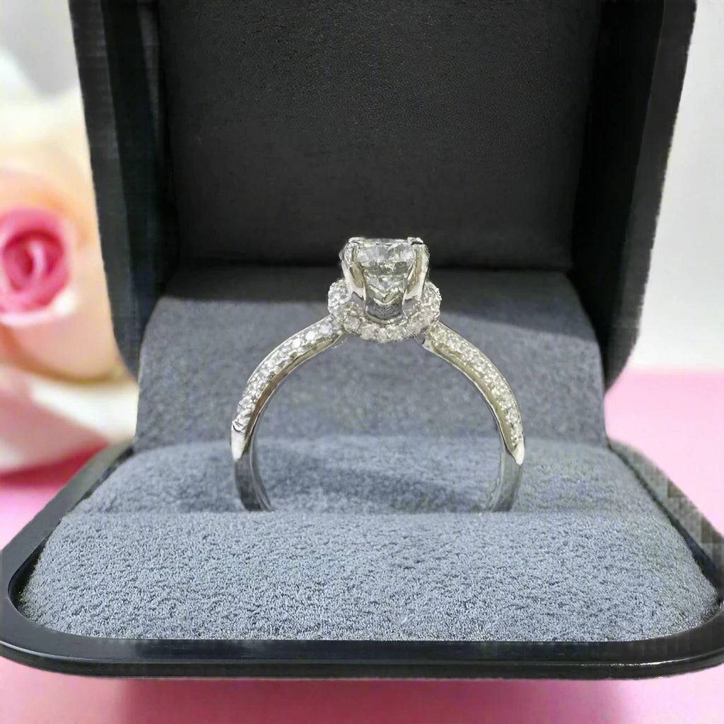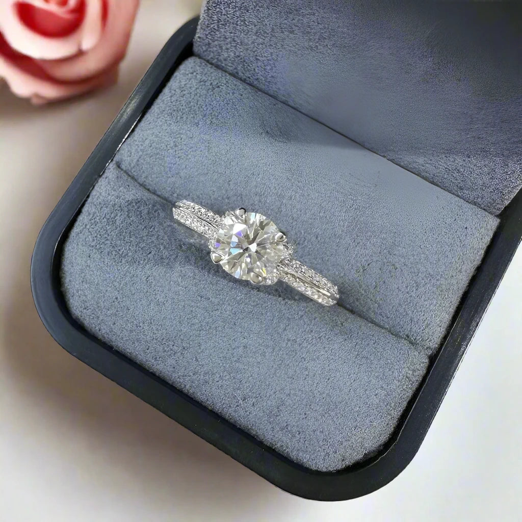 Unleash the magic with our 6mm round cut Certified Moissanite engagement ring. This exquisite piece features a 0.8 carat Certified Moissanite stone that exudes a stunning brilliance. Crafted from high-quality 925 silver dipped 5x in 18k white gold, this ring offers a blend of elegance and affordability that is truly unmatched. Let the mesmerizing sparkle of this gorgeous ring from Black Diamonds New York be a constant reminder of your special bond.