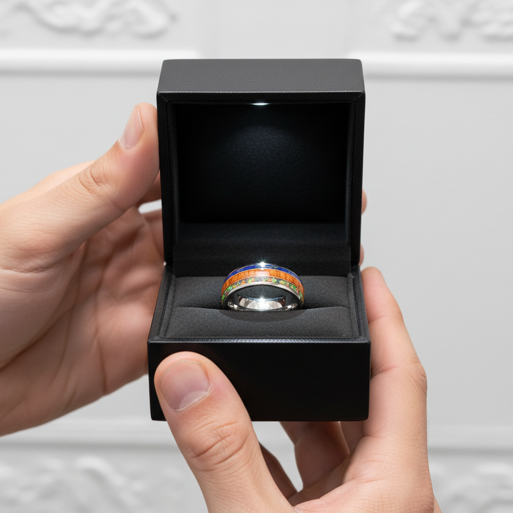 Introducing our stunning 8mm Tungsten Wood & Opal Men's Wedding Band by Black Diamonds New York! Crafted with high-quality materials, this gorgeous piece combines the timeless elegance of wood and opal. The striking 8mm width ensures a bold statement on your finger, while the lightweight design guarantees comfort throughout the day. Embrace the precious beauty of nature without breaking the bank, as our affordable price brings you the perfect blend of style and affordability. With this exceptional wedding band, celebrate your special day in style!