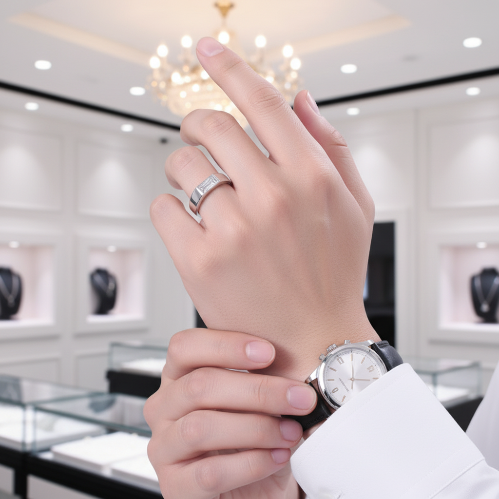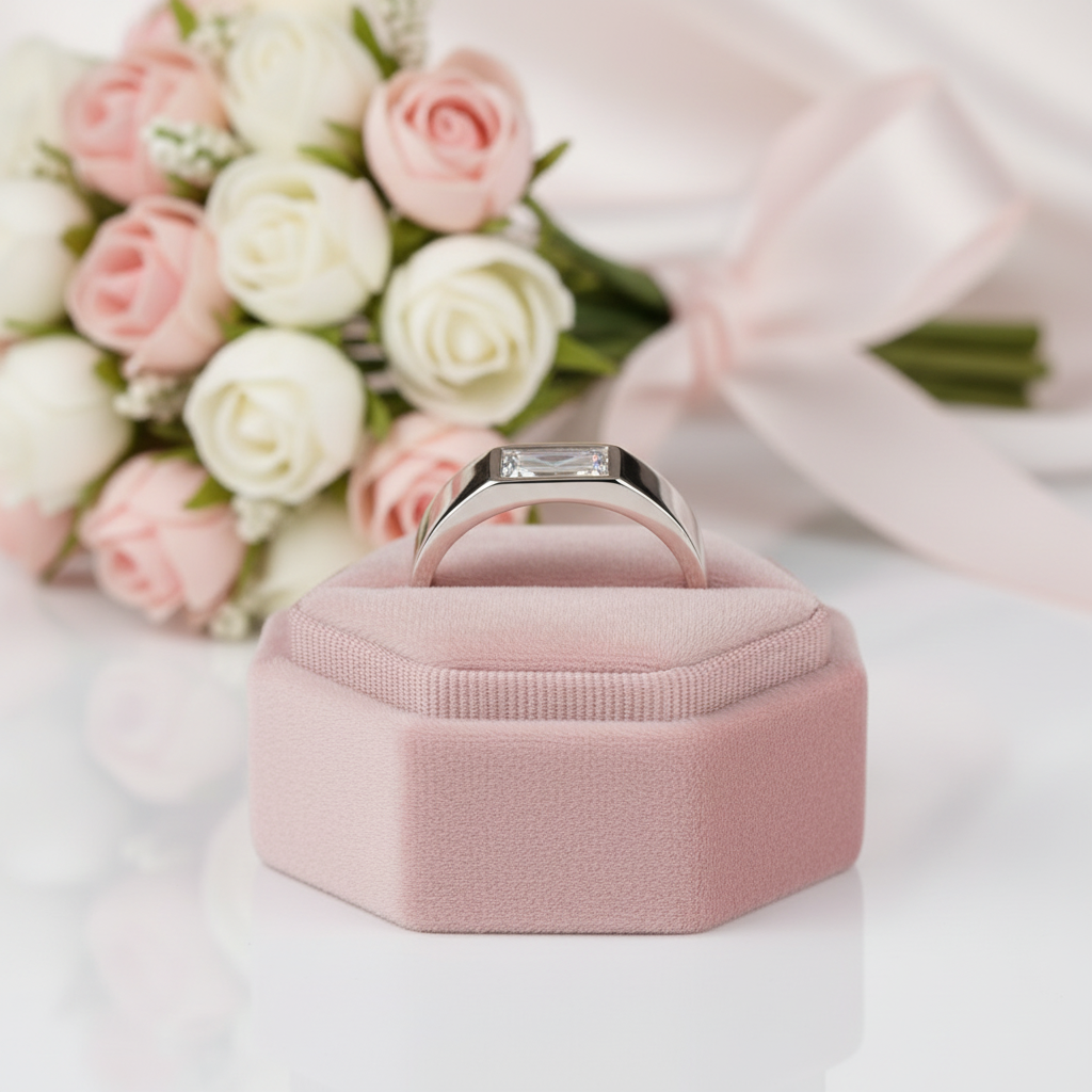 Elevate your style with our Baguette Cut Men’s Wedding Band, a handcrafted masterpiece featuring radiant simulated diamonds that shine like natural stones. Expertly cut and polished with precision, each stone reflects brilliance, fire, and luxury, without the high price tag.