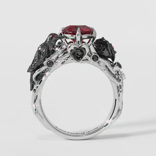 A striking 1.25 carat red diamond takes center stage in this gothic wedding ring, set against intricate dark detailing in sterling silver. Bold, mysterious, and unapologetically romantic—perfect for those who want their ring to match their edge.