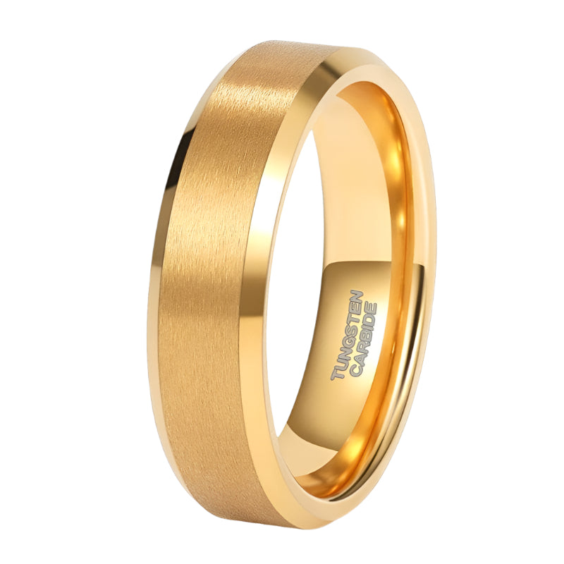 This men's wedding band features durable tungsten with a stylish brushed gold plating. Crafted from high-quality, ethically sourced materials, it offers lasting strength and timeless appeal without the high price.