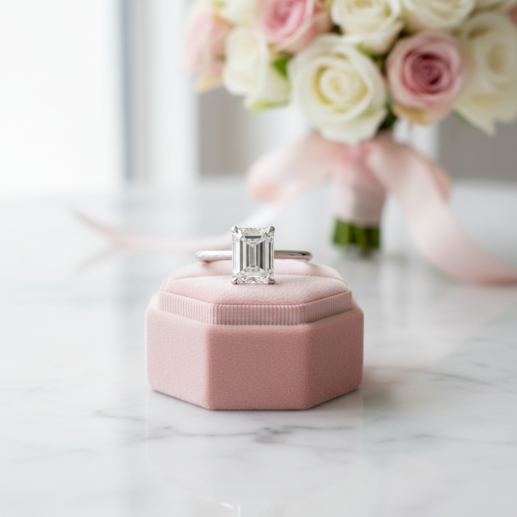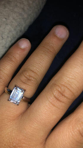 An elegant solitaire engagement ring showcasing a striking emerald-cut stone. Timeless design with clean lines that highlight the stone's beauty.