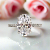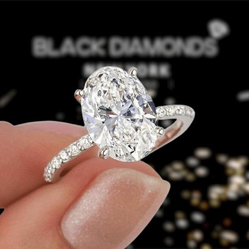 Fulfill your desires with the Classic Oval-cut Diamond White Gold Engagement Ring from Black Diamonds New York. Crafted from 14K white gold, the magnificent 3.5 carats oval-cut center diamond is surrounded by sparkling round side stones for a luxurious and high-end appearance. Enjoy a stunning look at an affordable price that everyone is sure to admire.