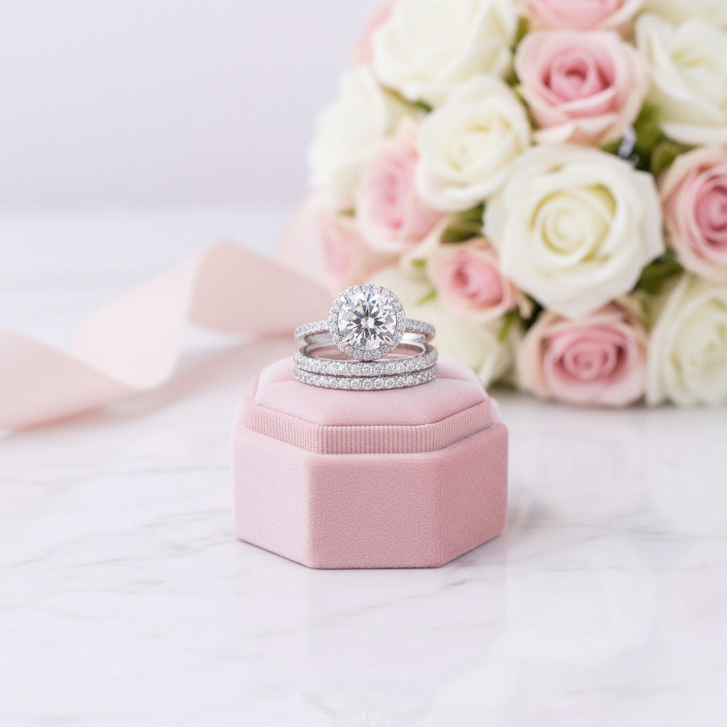 A three-piece wedding set with a round-cut diamond center stone surrounded by a halo of accent diamonds. Designed to work together as a complete bridal collection, these pieces offer timeless elegance for your special day.