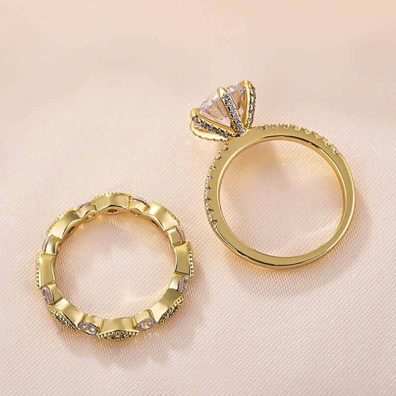 Timeless, elegant, and handcrafted to perfection. This yellow gold 6-prong round cut simulated diamond wedding set captures the brilliance of a natural diamond at a fraction of the price.