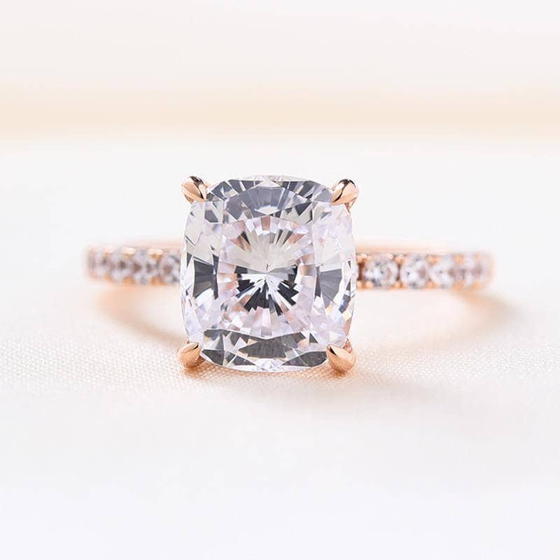 This stunning 3.0ct Cushion Cut Rose Gold Clear Simulated Sapphire Wedding Ring Set is the epitome of luxury. Crafted from sterling silver, this beautiful and elegant set is adorned with glimmering three-carat diamond stones that will leave you dazzled. From the gorgeous and sparkly stones, to the subtle lines of the design, it's sure to take your breath away. With this exquisite ring set, your love will shine brighter than ever. Capture the light of your love with this magnificent ring set.