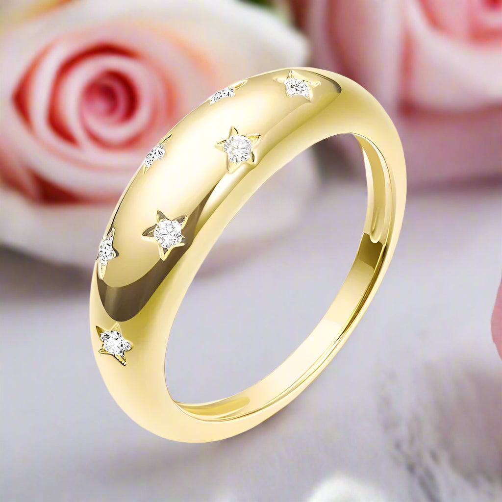 Discover the stunning beauty of our Dome 1.5mm Certified Moissanite Diamond Wedding Band. Crafted with the highest quality, this band showcases round-cut moissanite stones carefully placed in a domed design, creating a breathtaking and captivating appearance. The gorgeous sparkle and affordable price make this band a perfect addition to anyone's big day, giving them the chance to shine without compromising on quality or style. Made with 925 silver dipped five times in 18k gold, this band is truly one-of-a-kind.
