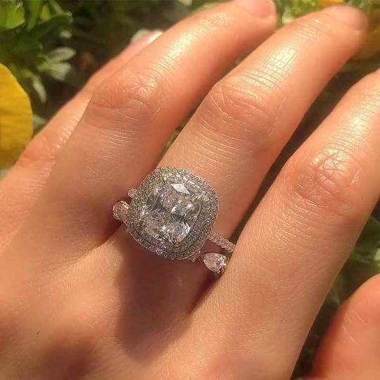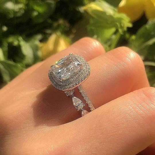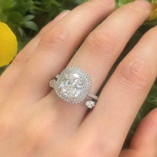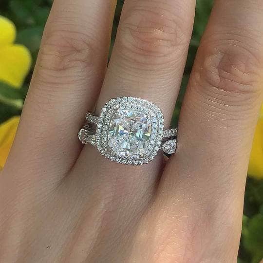 Stunning double halo cushion cut wedding ring set in white gold with handcrafted diamond embedding. Perfect for engagements, weddings, anniversaries, or special occasions. An exquisite gift that makes any moment unforgettable.