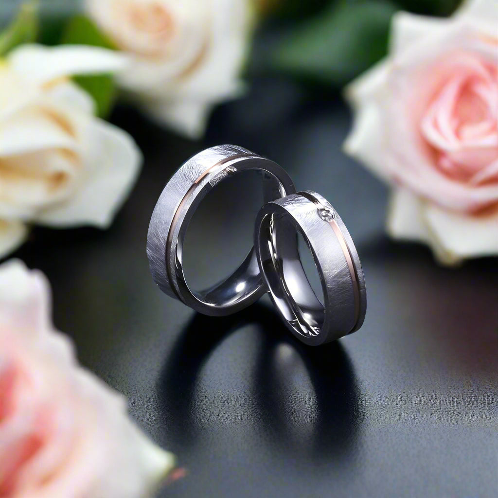 Indulge in the luxury of our Elegant Diamond Mass Brushed Rose Gold Stripe Wedding Band. Crafted with the finest materials, this band features a polished 6mm width for men and a dazzling 6mm width for women, adorned with a created diamond. The sophisticated round shape and bezel setting add a touch of elegance to this exclusive piece, made with stainless steel for lasting quality.
