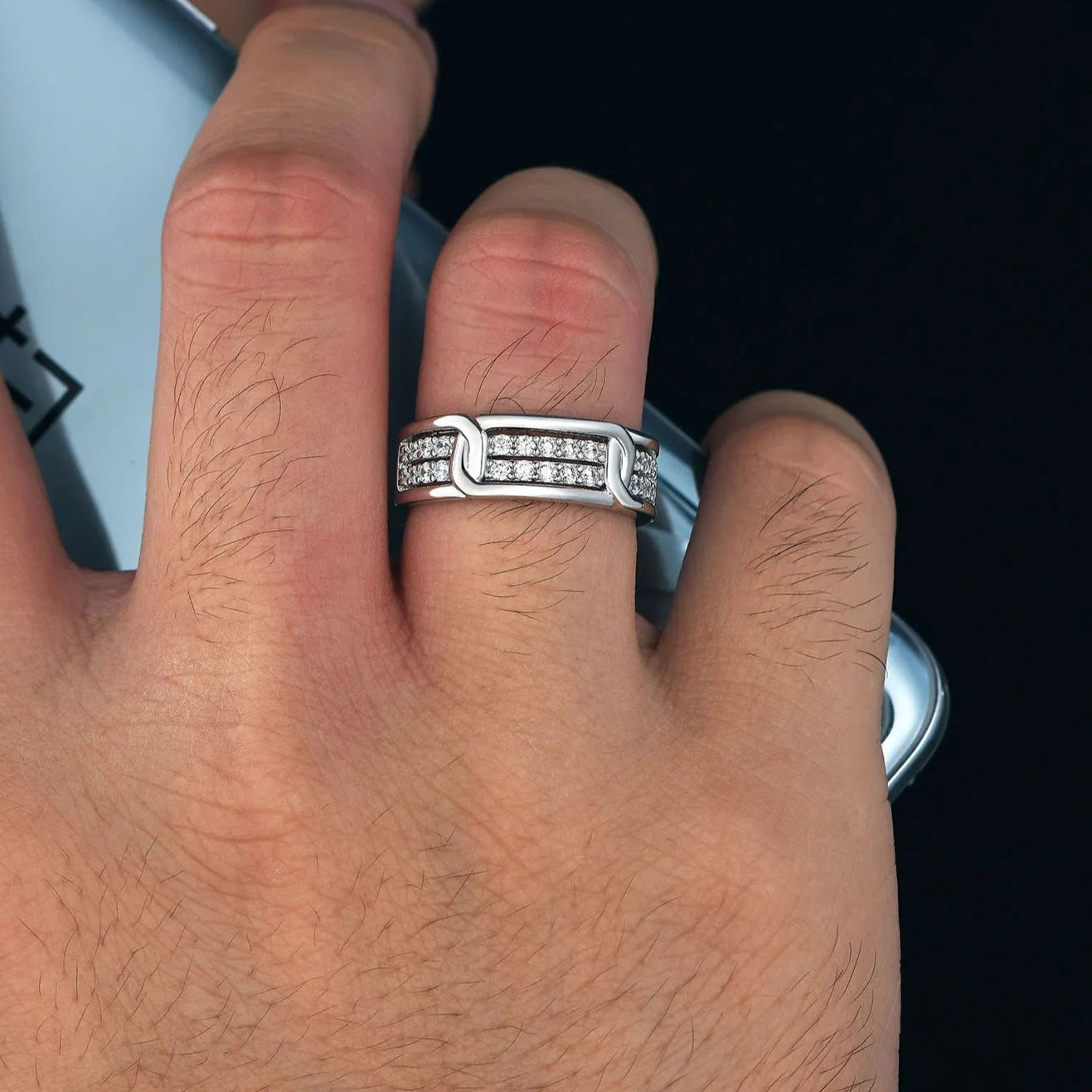 A stunning men's wedding band featuring a brilliant round diamond alternative set in 925 silver with a five-time 18k white gold dip. This elegant piece combines affordability with exceptional sparkle, making it the perfect choice to celebrate your special day in style.