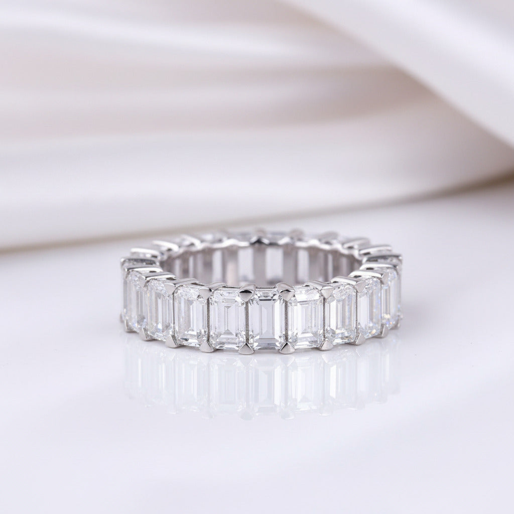 A timeless pairing designed for forever. This emerald cut engagement ring showcases the stone's sophisticated geometry and brilliant sparkle, complemented by a matching wedding band that flows seamlessly alongside it. The clean lines and elegant proportions create a refined look that feels both classic and distinctly modern. Perfect for those who appreciate understated luxury and architectural beauty in their jewelry.