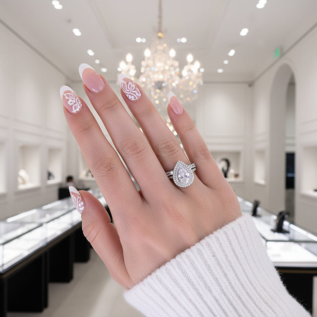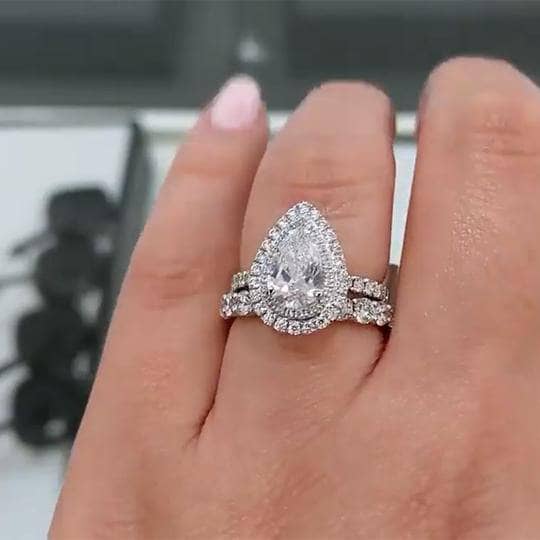 A timeless pear-shaped diamond takes center stage in this elegant wedding set, surrounded by a double halo of sparkling stones that amplify its brilliance. The design combines classic sophistication with modern glamour, creating a striking silhouette that captures light from every angle. Perfect for those seeking a distinctive yet refined bridal look that stands the test of time.