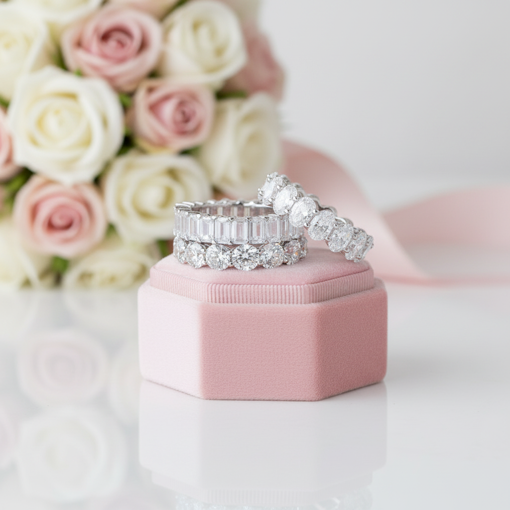 A timeless wedding band set featuring emerald, round, and oval cut stones in an eternity design. This luxurious three stone combination captures enduring elegance, with each cut complementing the others for a sophisticated bridal look. Perfect for those seeking a distinctive yet classic wedding band that celebrates commitment with refined style and lasting beauty.