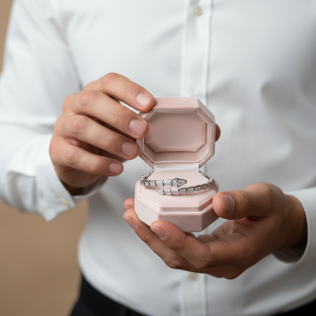 This Round Cut Moissanite Snake Bangle delivers genuine sparkle without the premium price tag. Crafted from 925 silver with a five-layer 18k white gold finish, it's built to last while maintaining that luxurious look. The brilliant round-cut stone catches the light beautifully, making it a versatile piece that works for everyday wear or special occasions. Simple, elegant, and affordable—exactly what you're looking for in a quality bangle.